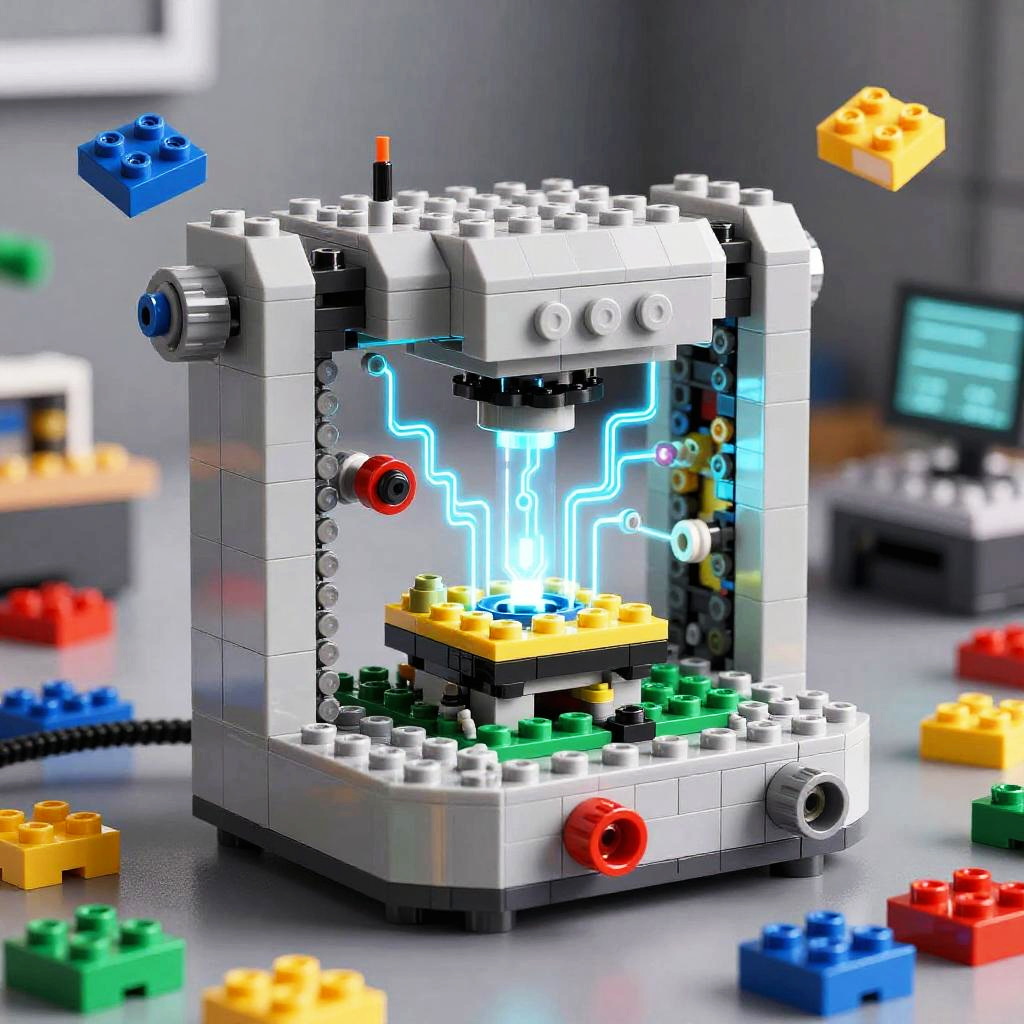 AI Lego set generator visualized as a high-tech machine producing intricate Lego models instantly, surrounded by floating 3D Lego parts and glowing circuits, combination of digital art and photorealism, futuristic workshop filled with colorful Lego pieces scattered around.