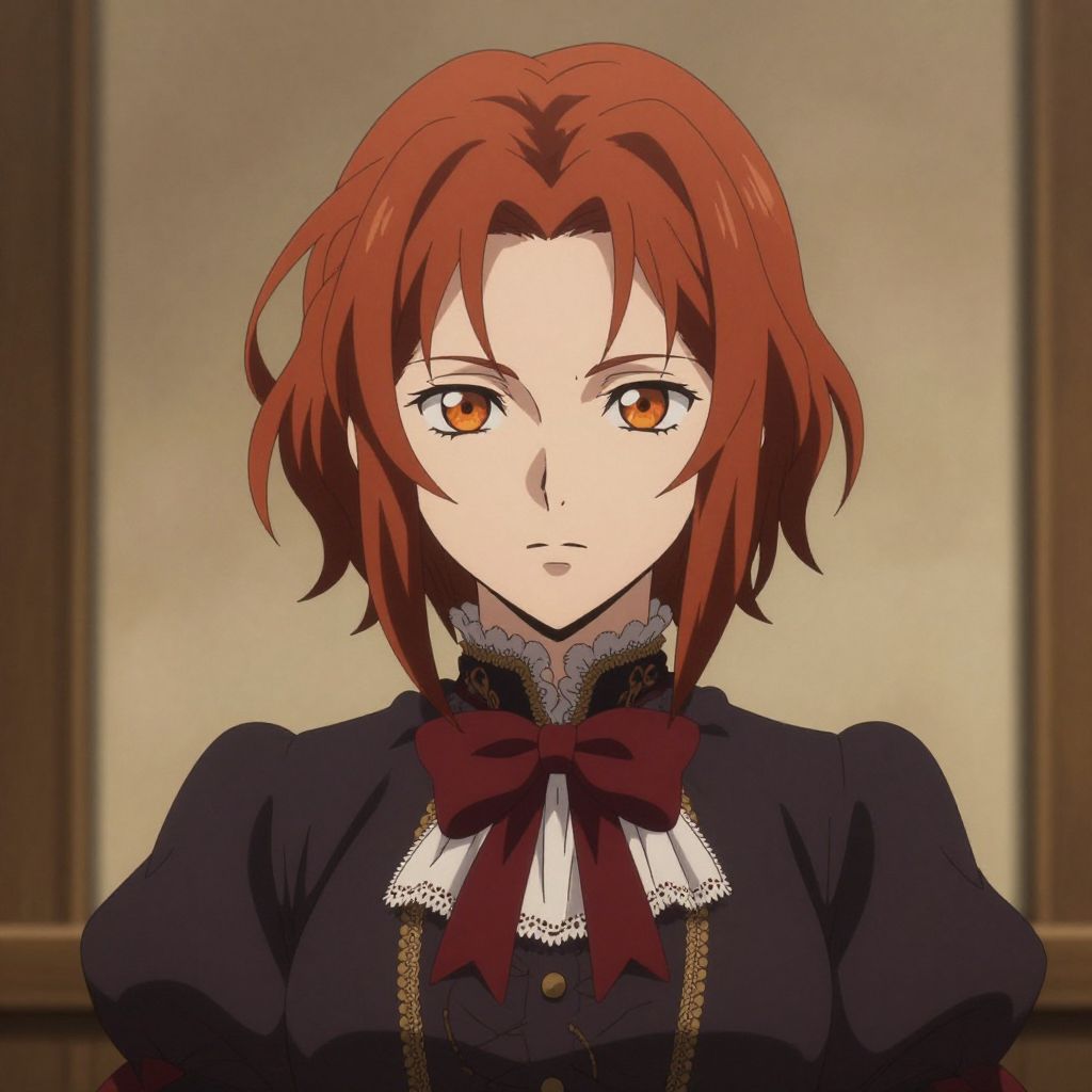 An anime vampire woman with short, slightly wavy red hair, wearing a dark Victorian dress with lace and a red bow, has stern orange eyes.