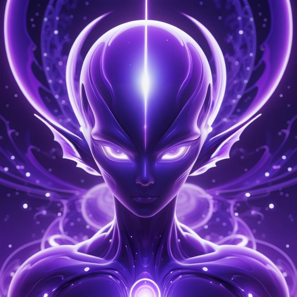 A glowing purple alien in an anime illustration style, ethereal and magical.