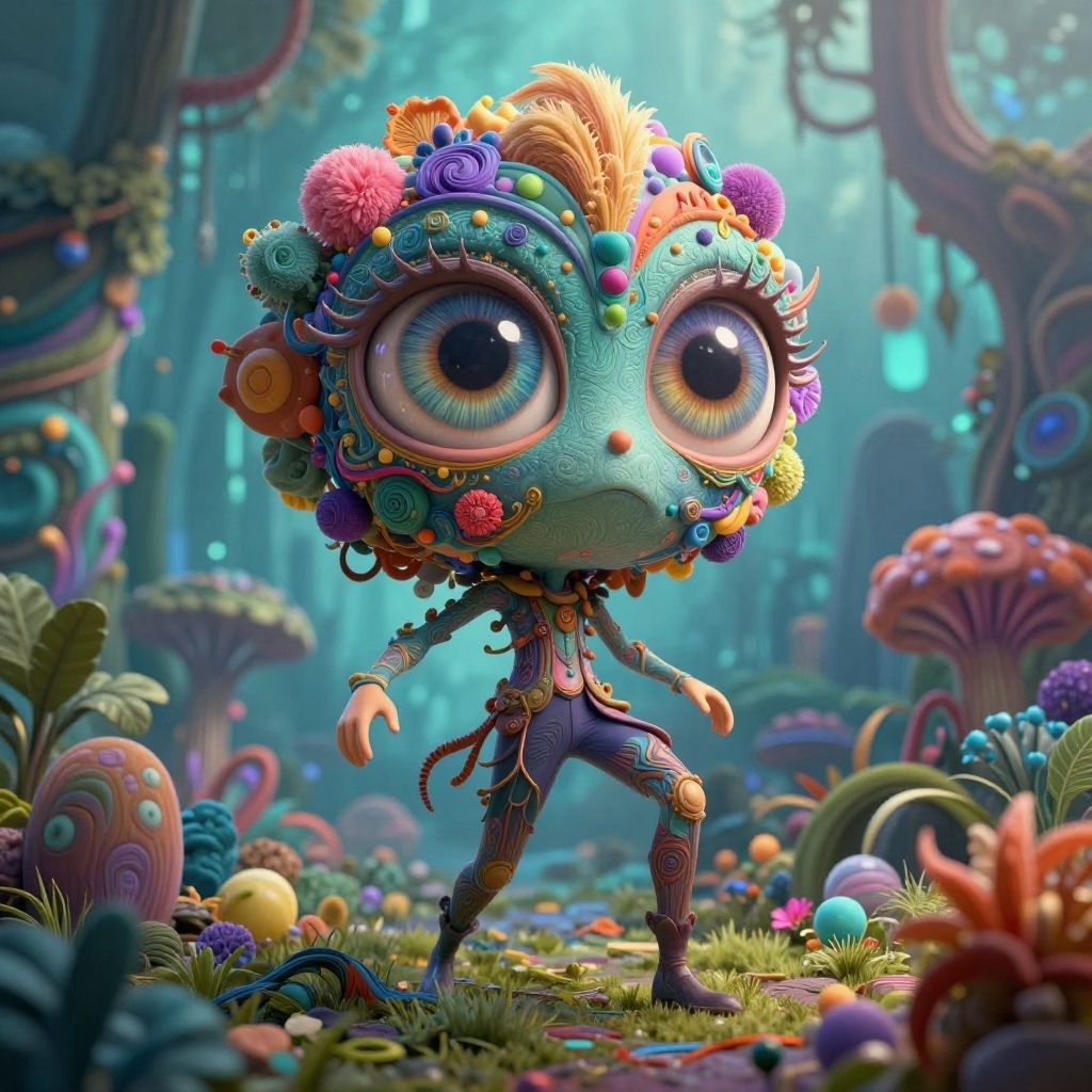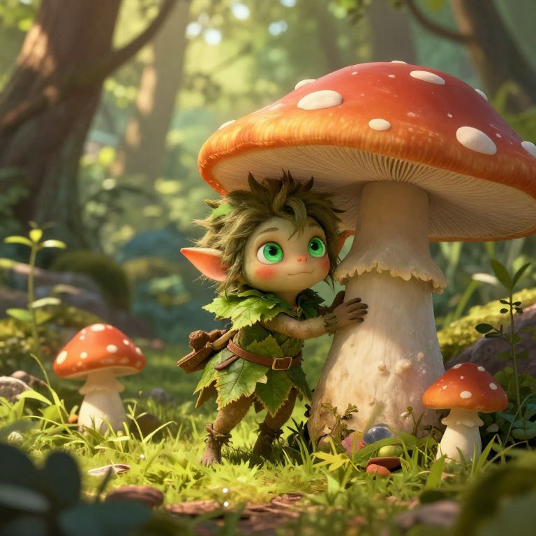 Anthropomorphic plant character with blooming flowers for hair, wooden bark skin, gentle expression, surrounded by butterflies and sunlight filtering through dense foliage