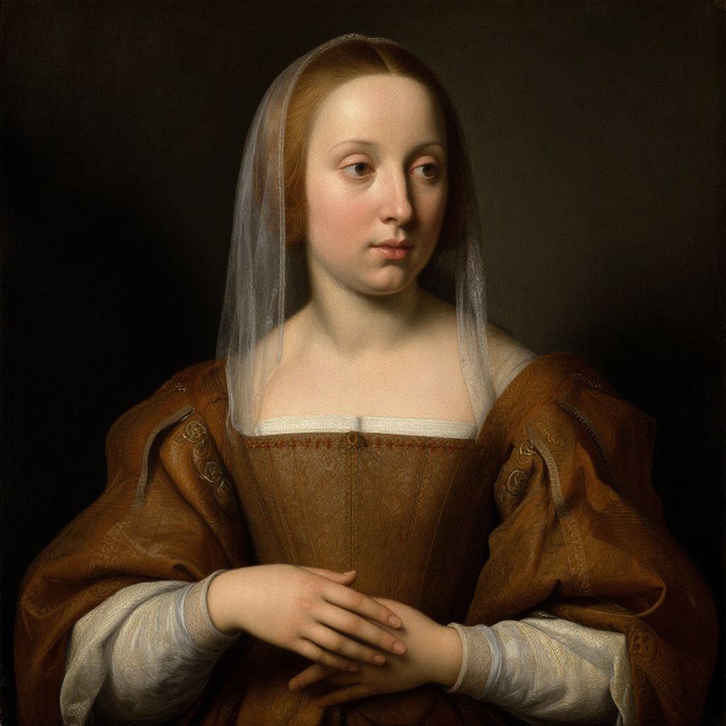 Baroque-style oil painting of a young woman with fair skin, brown wavy hair, and dark dress, set against a dark, shadowy background