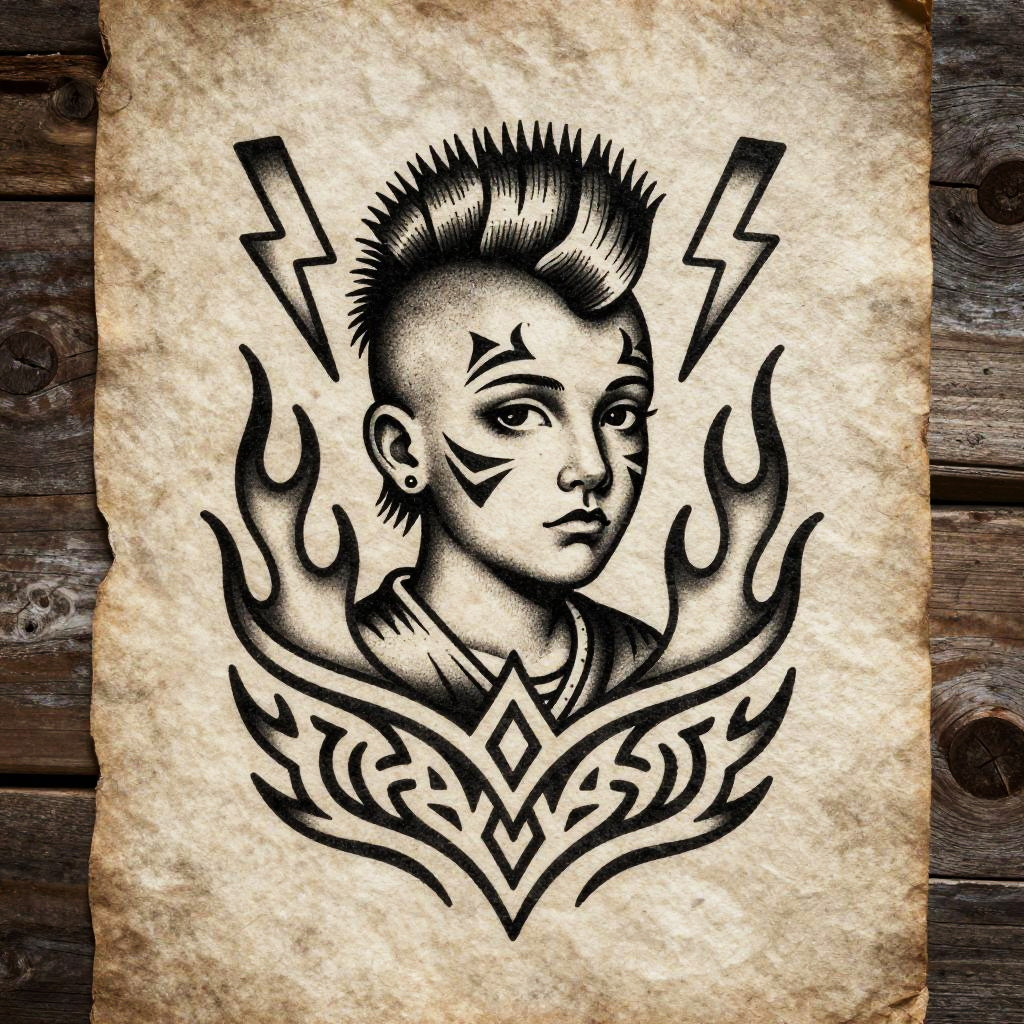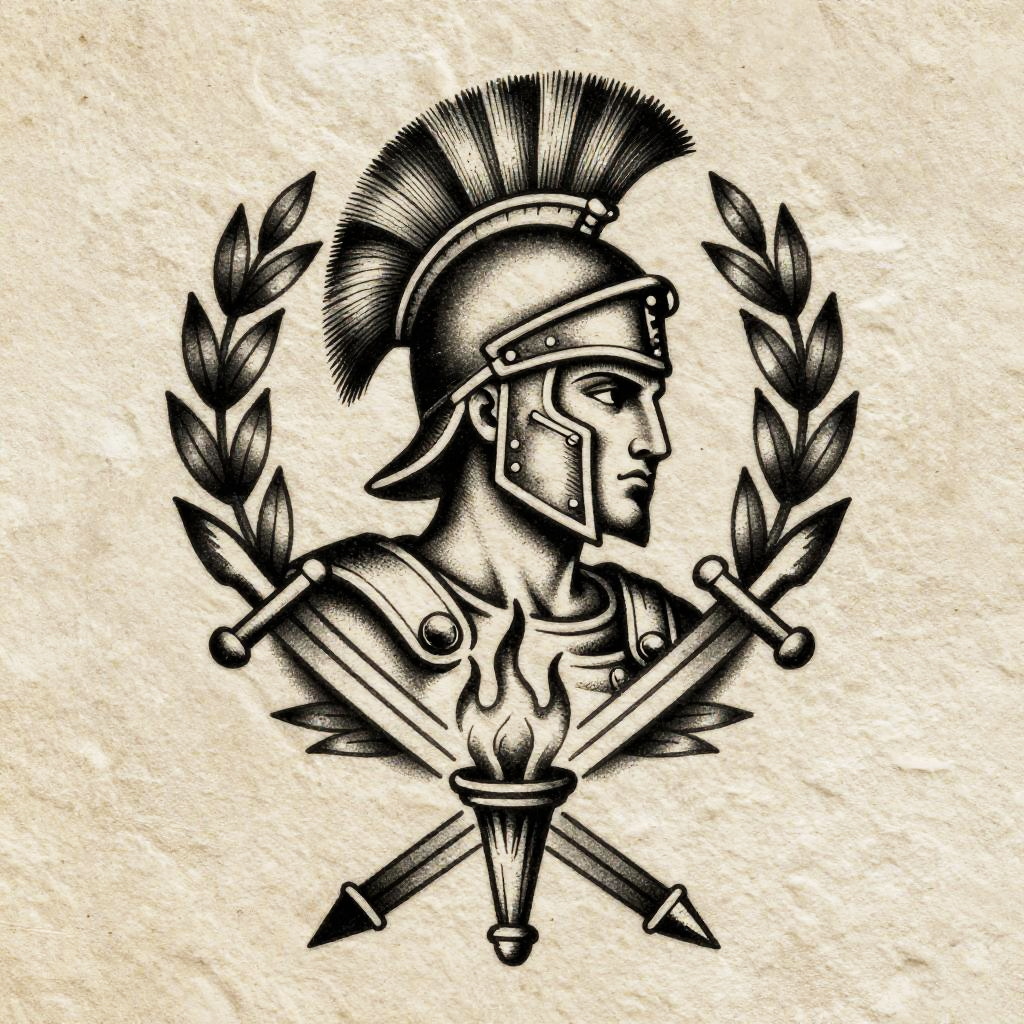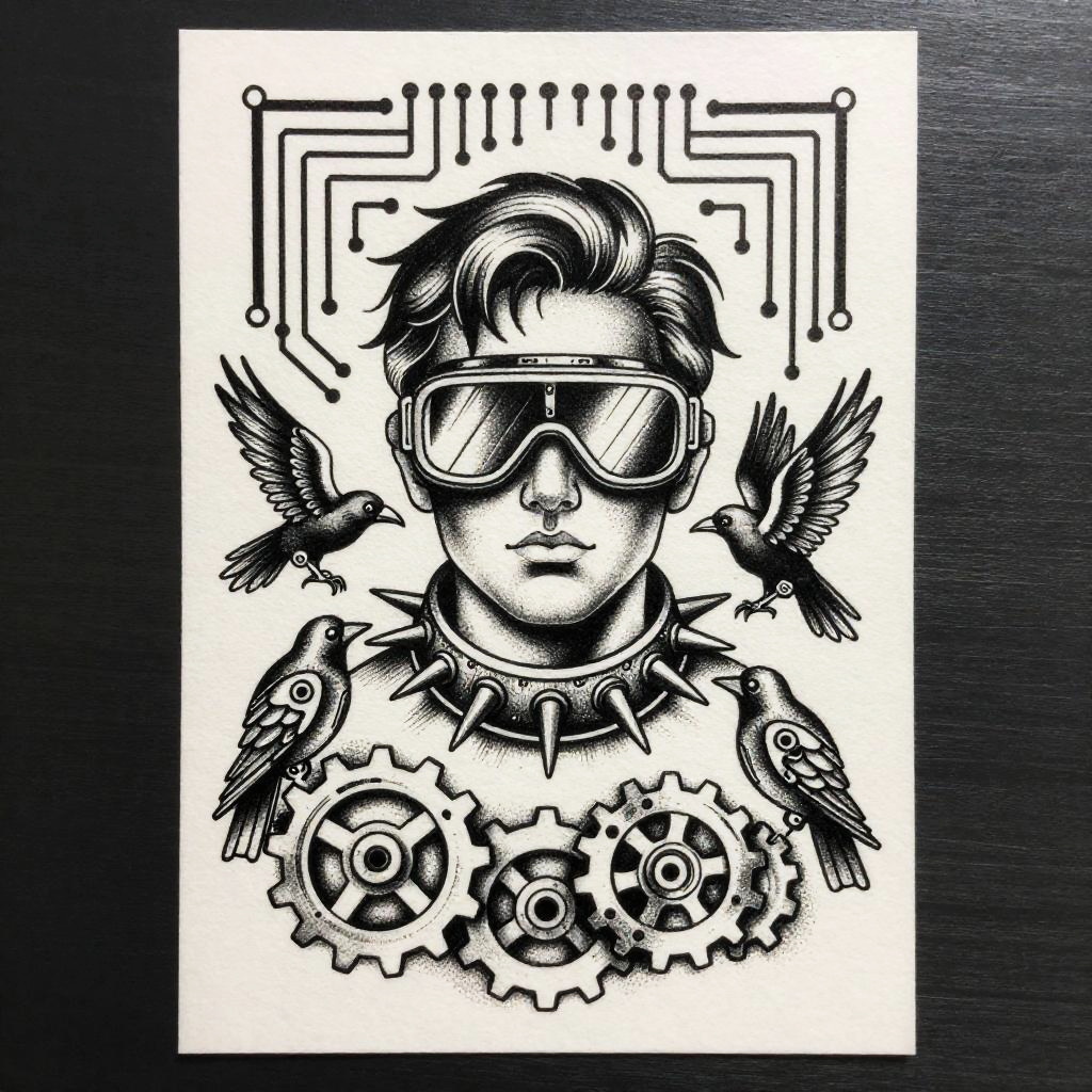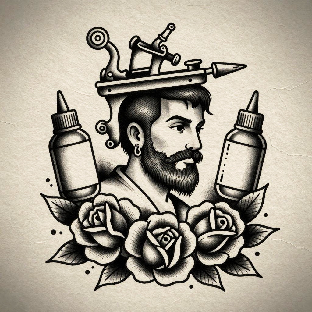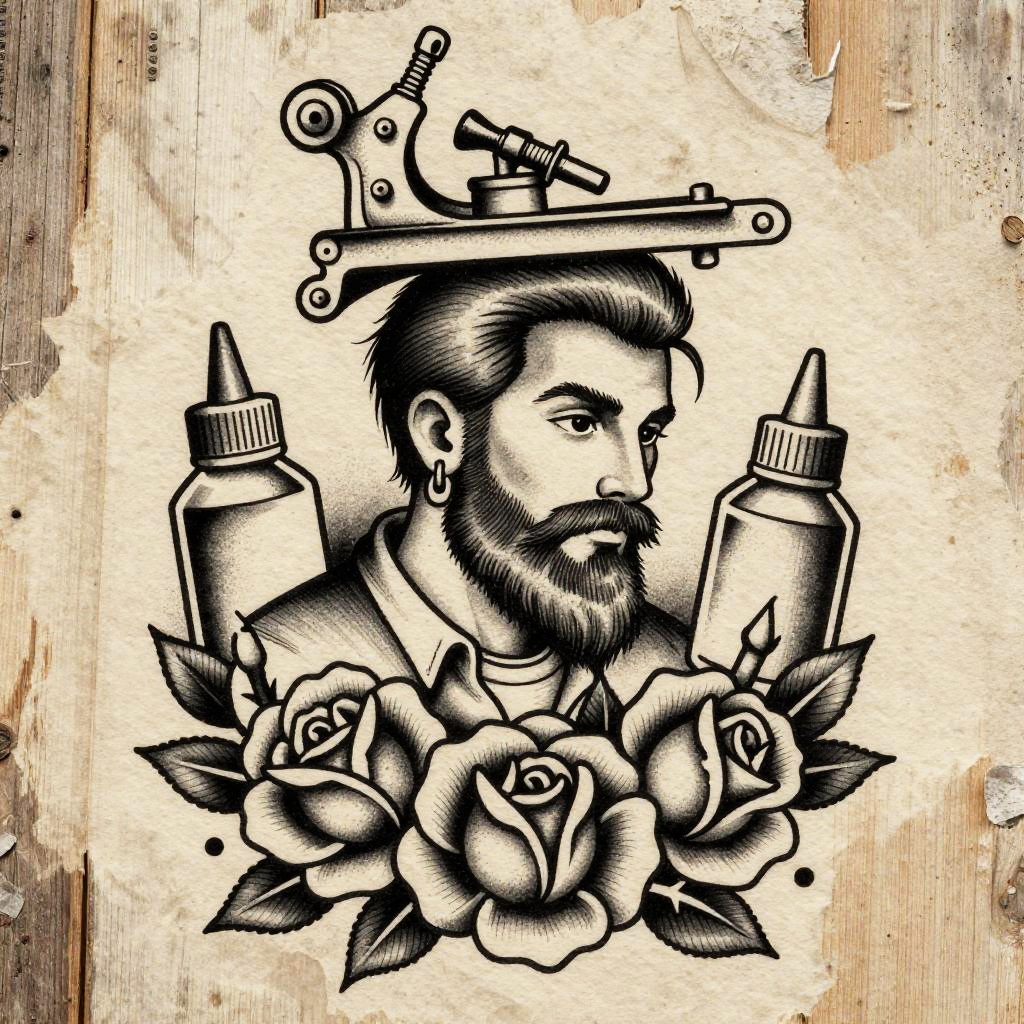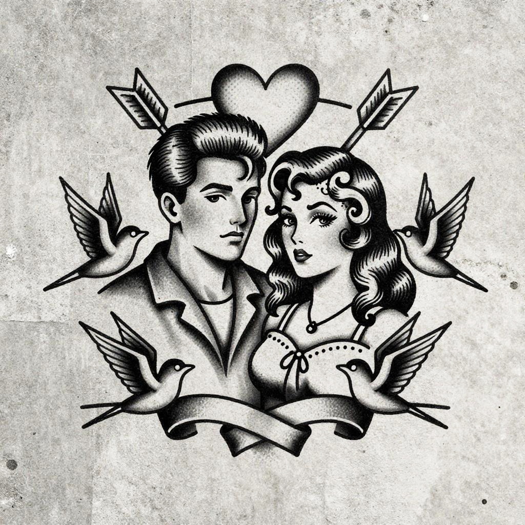 Monochrome ink illustration in a vintage tattoo flash aesthetic featuring young man with slicked-back hair and piercing eyes, framed by dagger piercing a heart above, roses on either side, and a banner with text below. Printed on cracked leather texture, with crisp linework, stippling and crosshatching, bold negative space, subtle vignette, museum-print finish, high contrast, fine detail, gritty yet elegant mood.