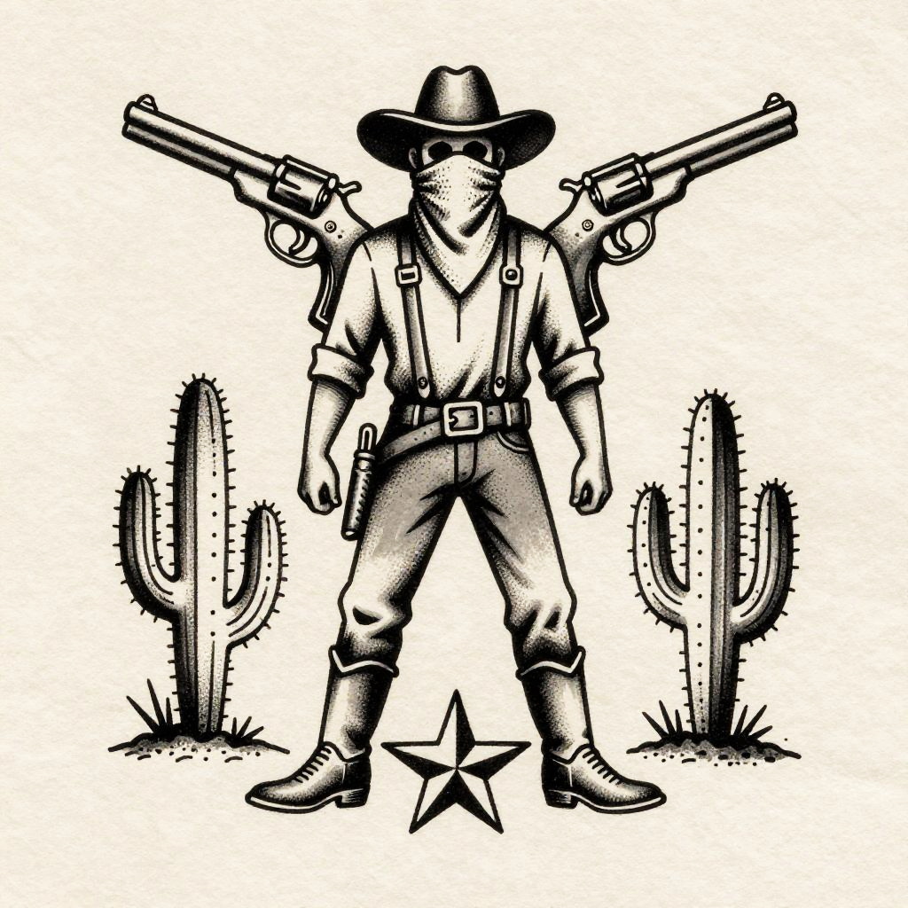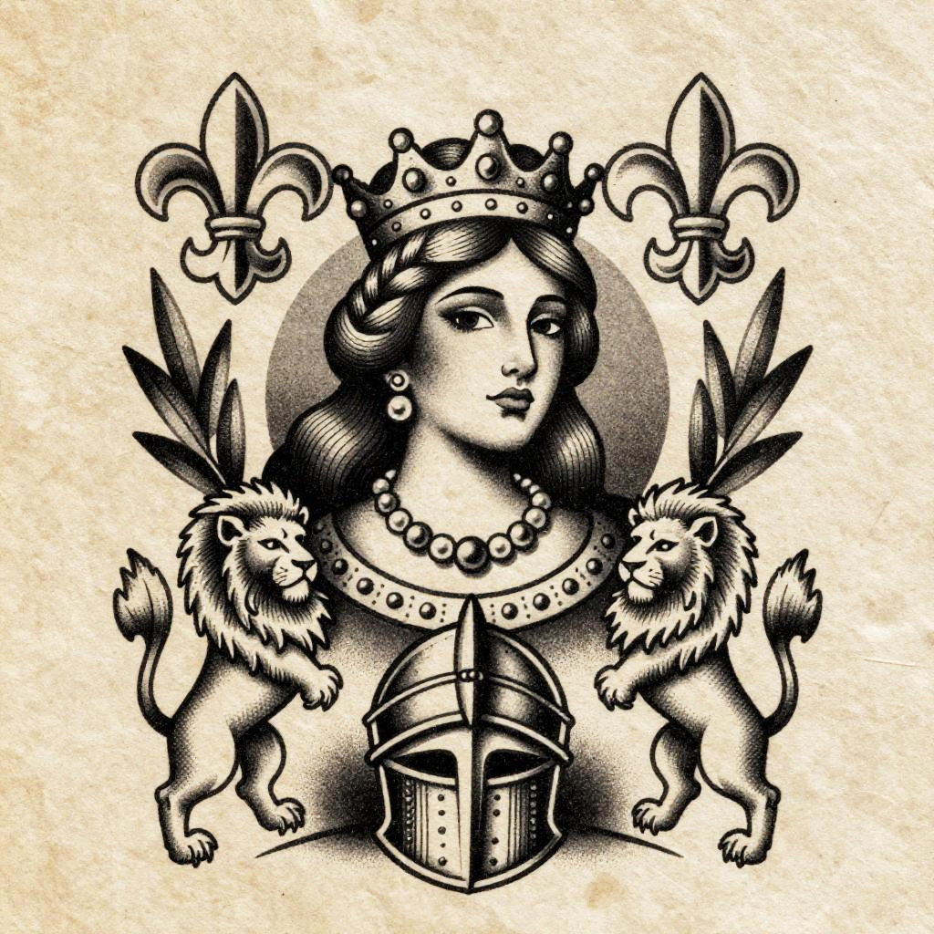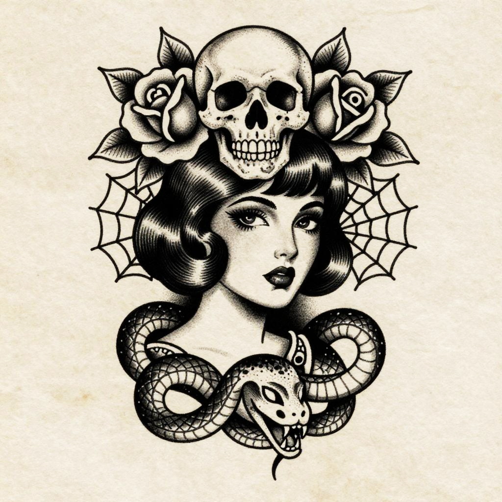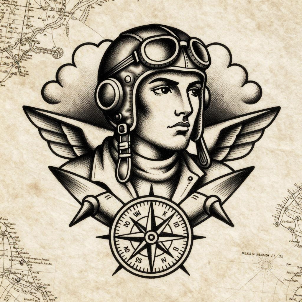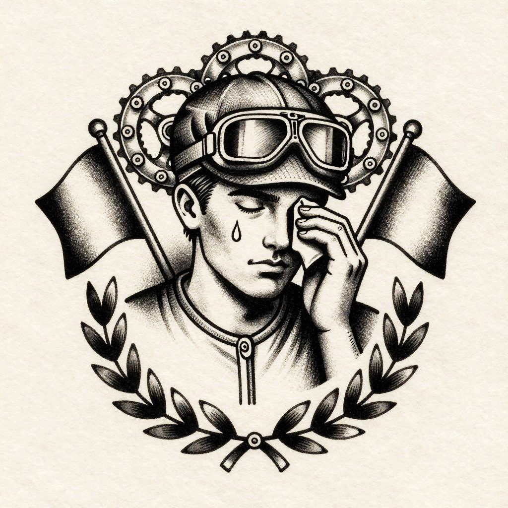 Monochrome ink illustration in a vintage tattoo flash aesthetic featuring young man with slicked-back hair and piercing eyes, framed by dagger piercing a heart above, roses on either side, and a banner with text below. Printed on cracked leather texture, with crisp linework, stippling and crosshatching, bold negative space, subtle vignette, museum-print finish, high contrast, fine detail, gritty yet elegant mood.