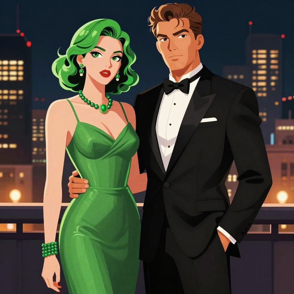 A stylish digital illustration of a confident woman and a man dressed in elegant evening attire, standing against a cityscape backdrop at night. The woman features vibrant green hair and matching accessories, while the man wears a classic black tuxedo with a bow tie, presenting a sleek and modern graphic novel art style.