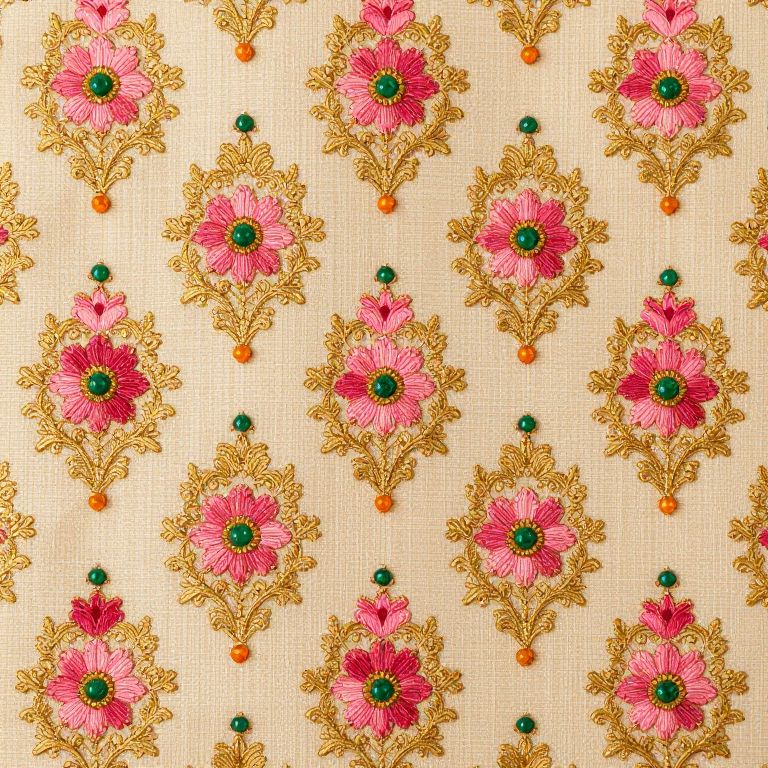 Indian yard kutch embroidery fabric showcases intricate patterns featuring repeating motifs of gold and pink floral designs, embellished with small green and orange beads, set against a textured beige background.