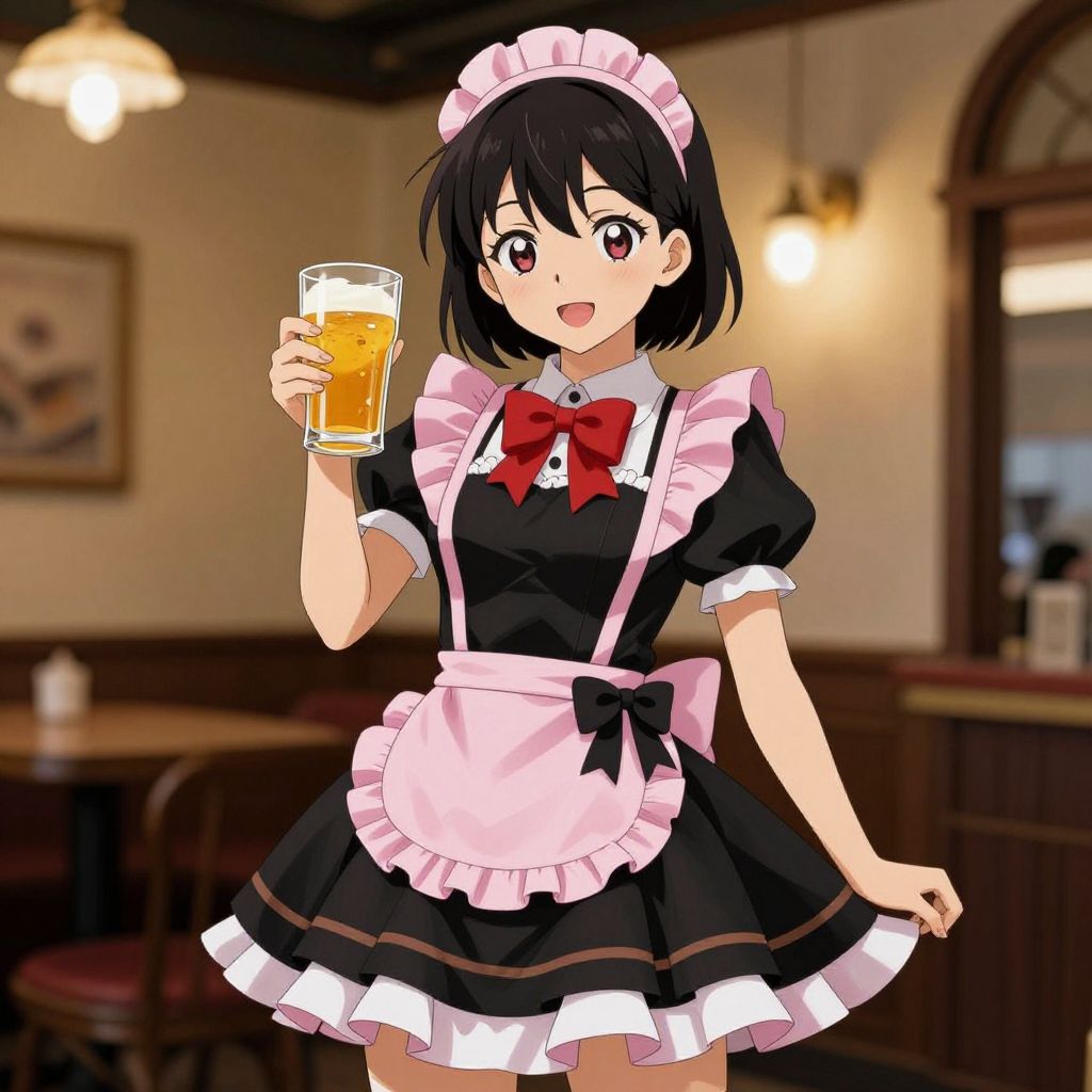 A vibrant anime-style illustration depicts a woman in a French-inspired sissy maid costume, featuring a black and pink dress with frills and a red bow, holding a glass of beer, set against a warmly lit interior with a cozy, vintage aesthetic.