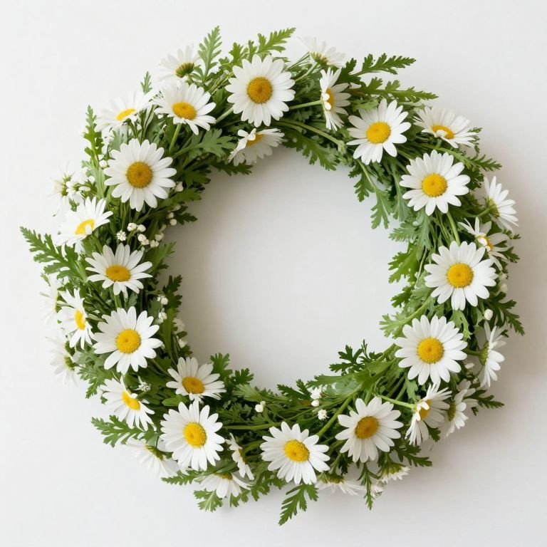An ethereal daisy wreath radiates purity and serenity, its delicate petals and vibrant greenery evoking a timeless sense of hope and renewal, while the soft scent of blooming flowers whispers a promise of enduring love.