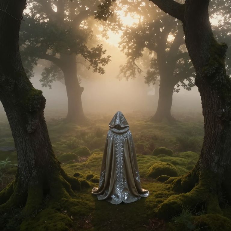 A solitary figure shrouded in an otherworldly fog stands resolute amidst the ancient trunks of towering oak trees, bathed in the golden light of dawn's first rays. The enigmatic character is draped in a vintage cloak, woven with intricate silver embroidery and shimmering threads that appear to dance with the gentle breeze. Captured from a bird's-eye perspective, this captivating scene reveals the lush moss carpeting the forest floor and the delicate details of the figure's attire. This unique piece merges the dreamy, light-drenched landscapes reminiscent of Hermes Monet with the hauntingly surreal ambiance of Salvador Dali's works, creating an evocative atmosphere that invites contemplation and wonder.