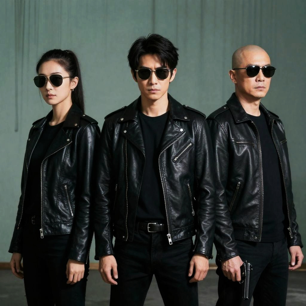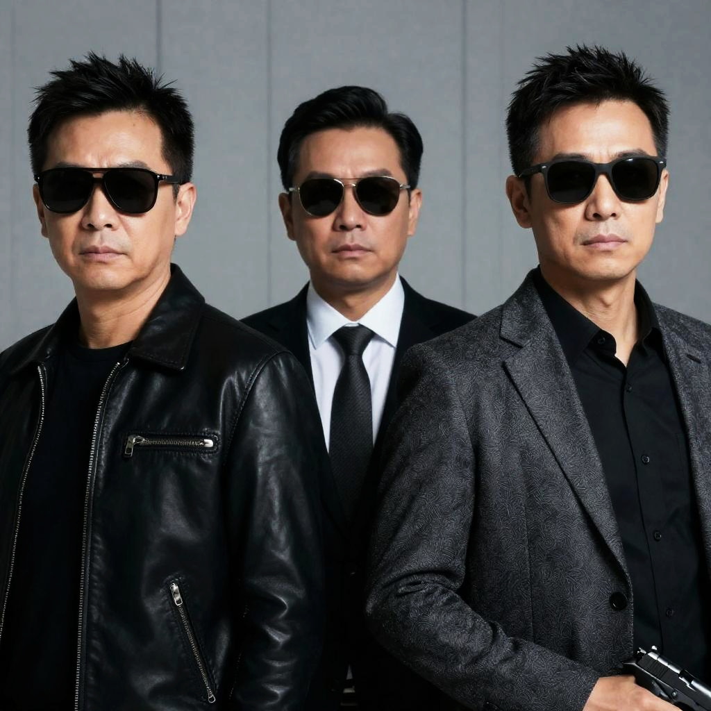 Photograph of three men near a small white and blue airplane. Foreground man in black suit and tie, black sunglasses, short dark hair, looking to the right. Background man in dark jacket, sunglasses, bald, descending from plane. Right man in dark leather jacket, black shirt, black sunglasses, looking to the left. All wear sunglasses, plane door open, overcast sky.