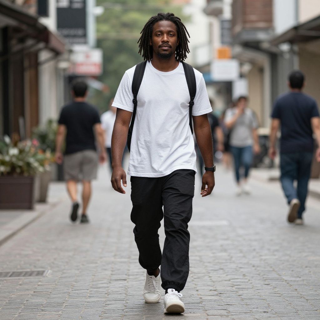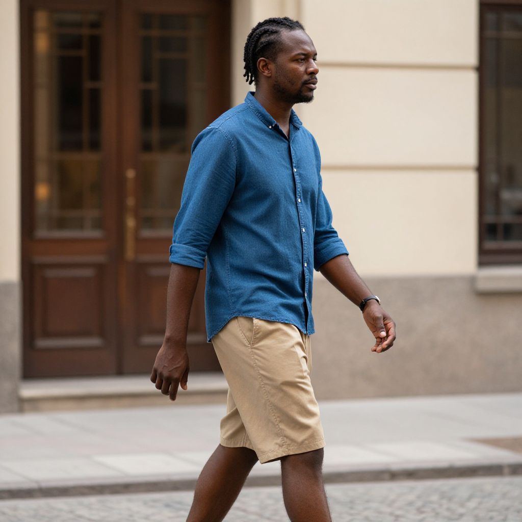 Photograph of a muscular Black man with dark skin, wearing a black sleeveless tank top, bright red shorts, a black scarf, and a black top hat with dreadlocks peeking out. He stands on a city street, surrounded by a blurred crowd of diverse people in casual attire. The background shows an urban setting with a building's wooden door and window. The man's expression is neutral, and the overall style is modern urban street fashion. The image has a slightly high-contrast, vibrant color palette.