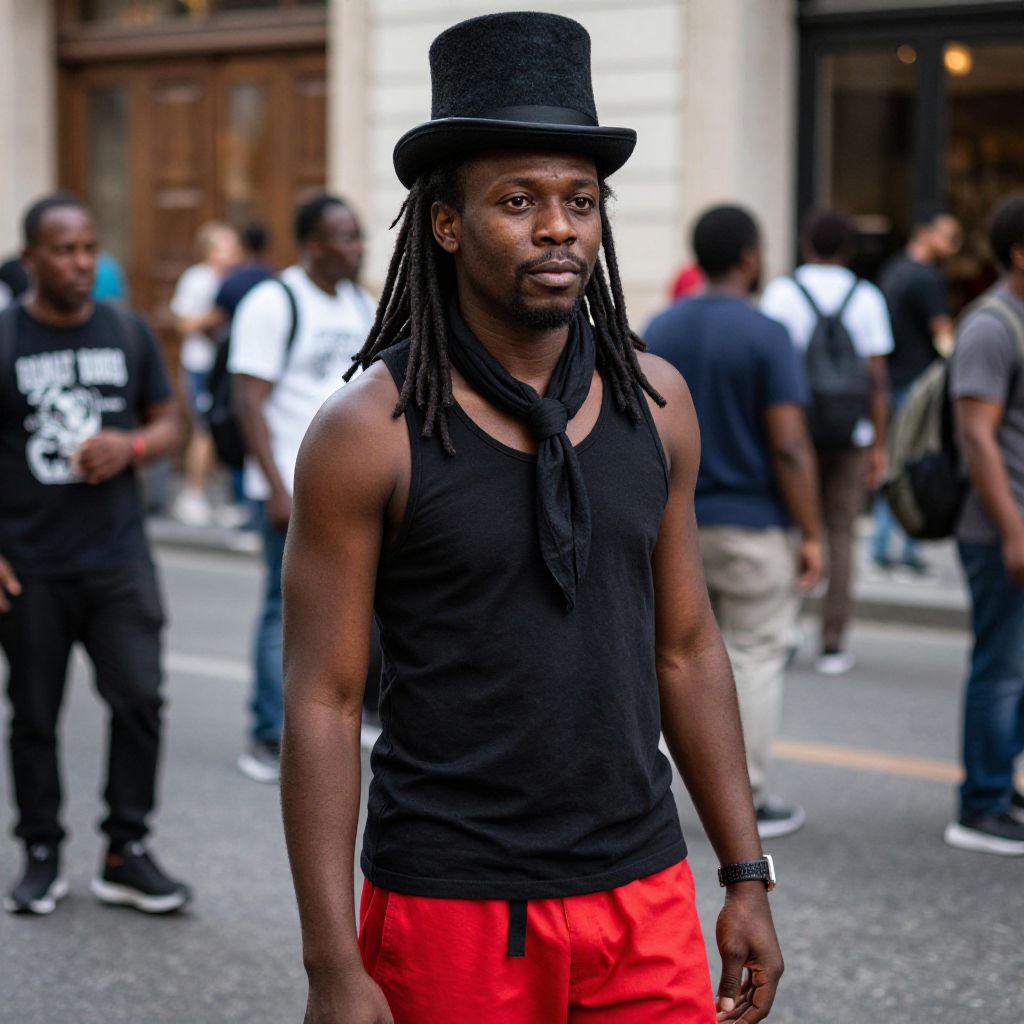 Photograph of a muscular Black man with long dreadlocks, wearing a black sleeveless tank top, red shorts, black scarf, and black top hat