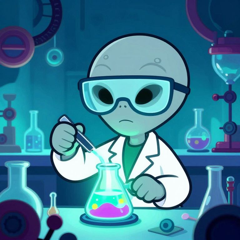 Gray alien cartoon scientist wearing oversized glasses, mixing colorful glowing chemicals in a laboratory filled with strange equipment, animated style with bold outlines and expressive face, futuristic and imaginative vibe with strong use of blues and greens.