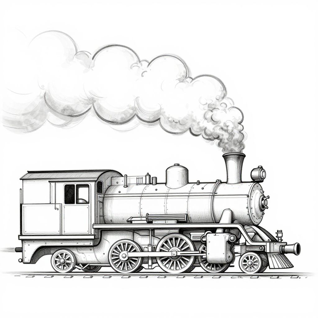 Steam train outline, side profile of old-fashioned steam engine with intricate steam and smoke clouds, minimalist black and white drawing, subtle shading and fine line details, a sense of motion captured through dynamic contours, vintage transportation theme