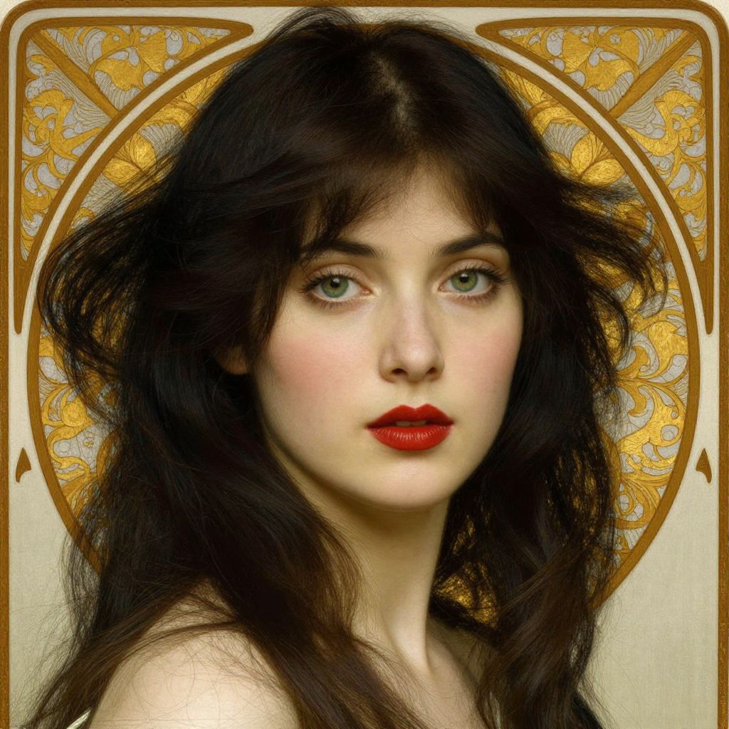 Elegant portrait of a woman with cascading dark hair, striking green eyes, and bold red lips framed by a golden Art Nouveau border, reminiscent of John William Godward's style in his 1910 work *Carina*.