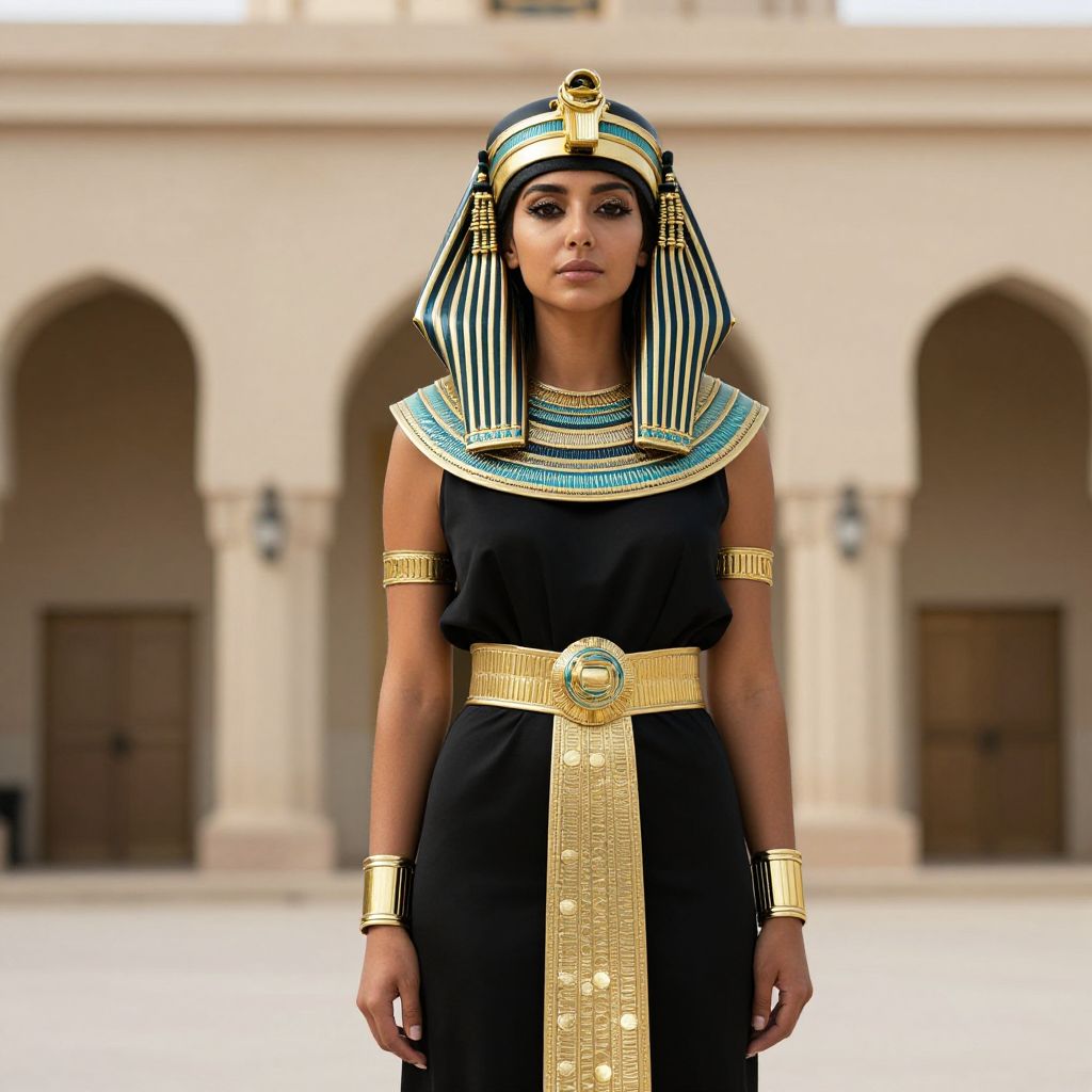 Photograph of a woman in an ancient Egyptian-style black dress with gold and blue striped headdress, gold jewelry, and detailed gold belt, standing in