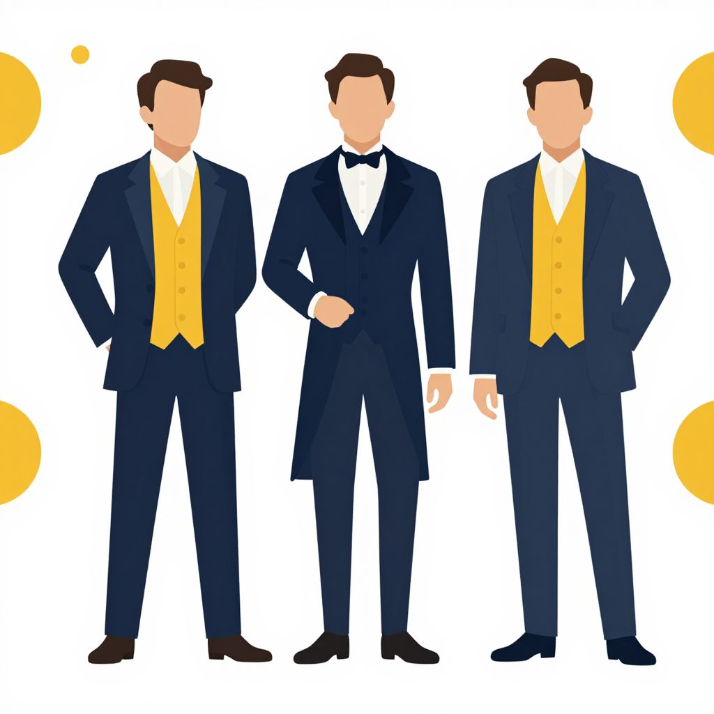 Digital illustration of three faceless men standing in a row. They are all wearing dark blue tuxedos with black bow ties, white dress shirts, and bright yellow vests. The man on the left has his hands on his hips, the middle man has his right hand in his pocket, and the right man has his hands relaxed by his sides. They are standing against a white background with yellow circular patterns in the corners. All three men have short, dark brown hair and are wearing black dress shoes. The illustration has a clean, flat design style with bold colors and simple shapes.