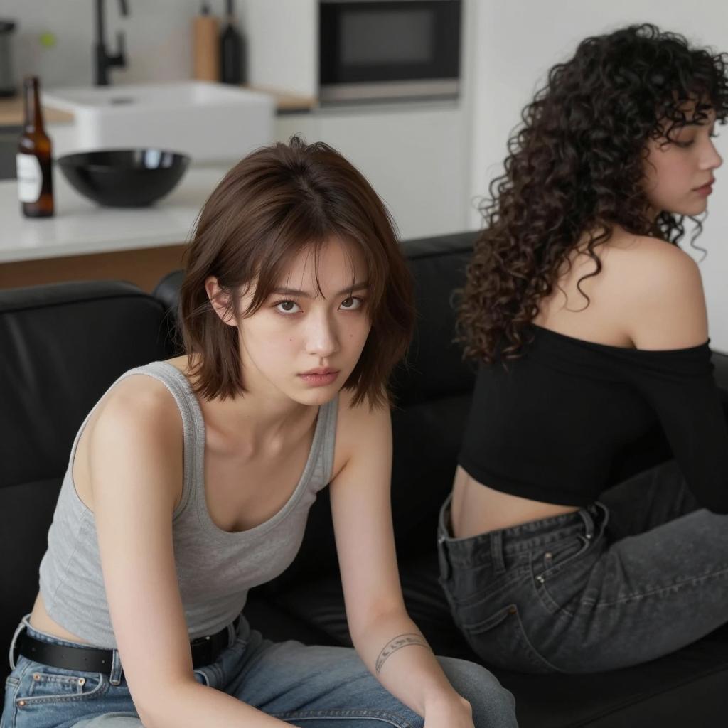 Photograph of two women standing against a ured gray wall. The woman on the left has short brown hair, a white sleeveless top, and a tattoo on her right arm. She leans slightly against the other woman. The woman on the right has short black curly hair, wears a black lace-trimmed spaghetti strap top, and has a cigarette in her mouth. Both women have hands on their hips. The woman on the right stands slightly taller. The woman on the left looks to the left, while the woman on the right looks directly at the camera.