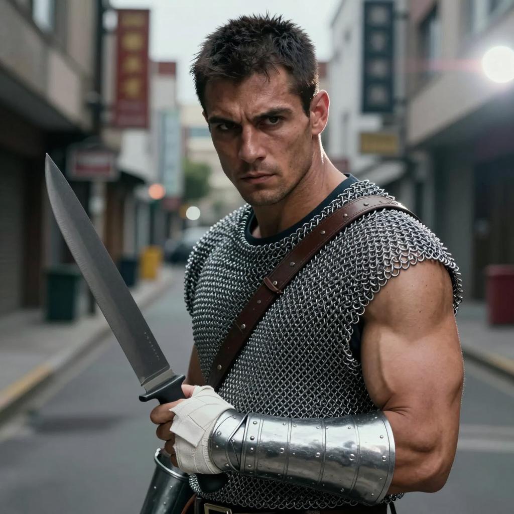A muscular man with a brown fedora and sleeveless brown shirt holds a large curved knife in his right hand. He has a determined expression and clenched teeth. He stands in a rocky, wooded landscape. His left hand grips a rope. The background shows green trees and a hilly terrain.