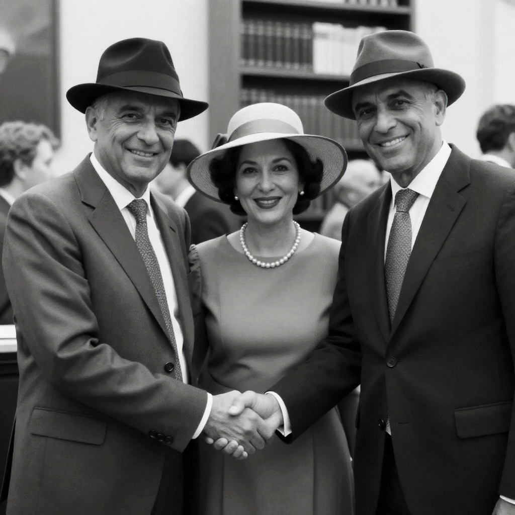 Black-and-white photograph of five men in military uniforms with decorative shoulder epaulettes, shaking hands and smiling. One older man in a suit stands between two uniformed men. Background includes patterned wallpaper and several onlookers. Three women in formal attire in the background, one smiling. Central focus on handshake. Formal indoor setting.