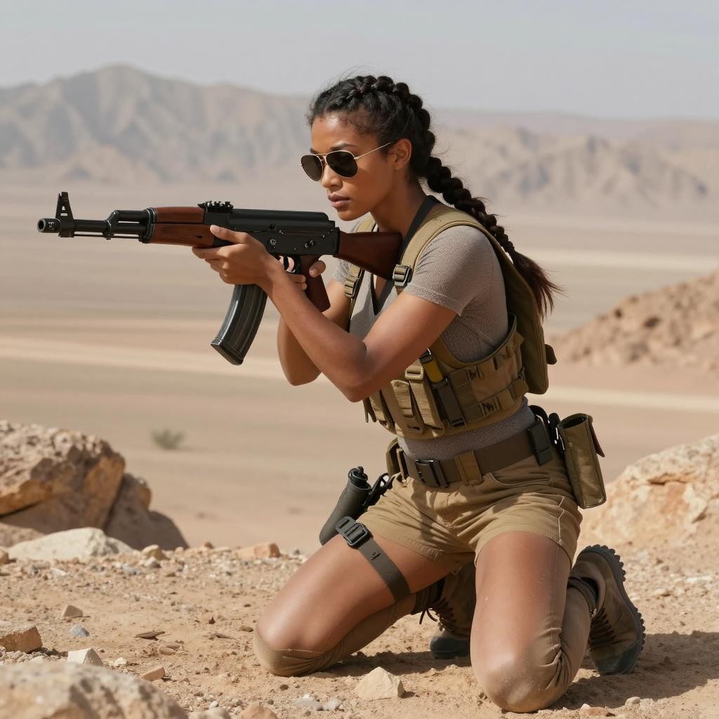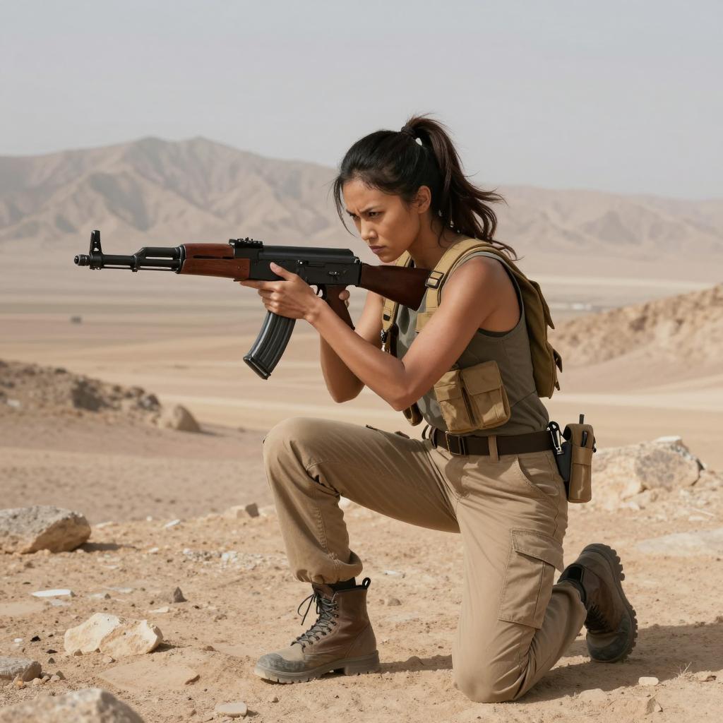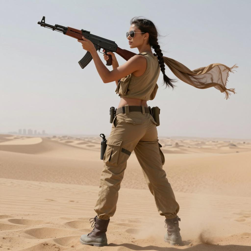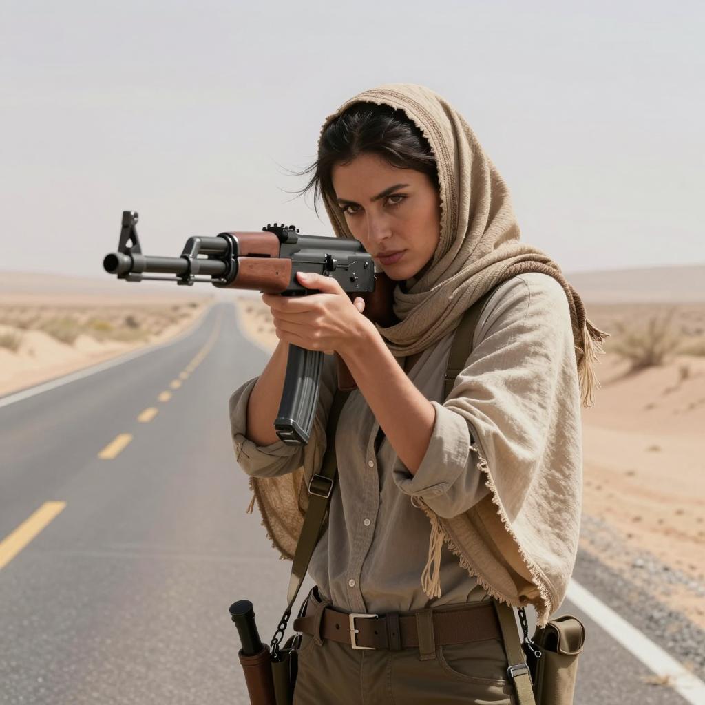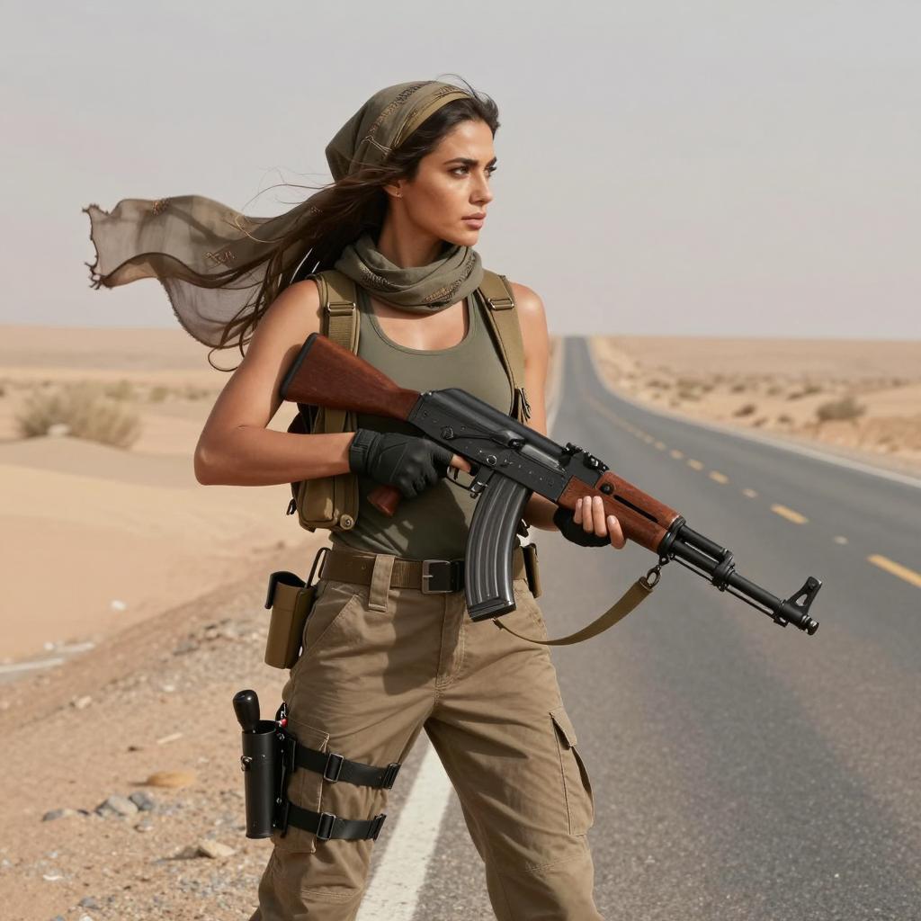 Woman with ak-47 gun in desert landscape, stylized non-violent action portrait, woman with dark hair tucked under a scarf and focused eyes wearing black tactical crop top and lightweight desert scarf posed kneeling in the sand with rifle held diagonally across her body in desert road stretching behind her into the distance, harsh sunlight, cinematic photography, high resolution, ultra-detailed, no blood, no gore