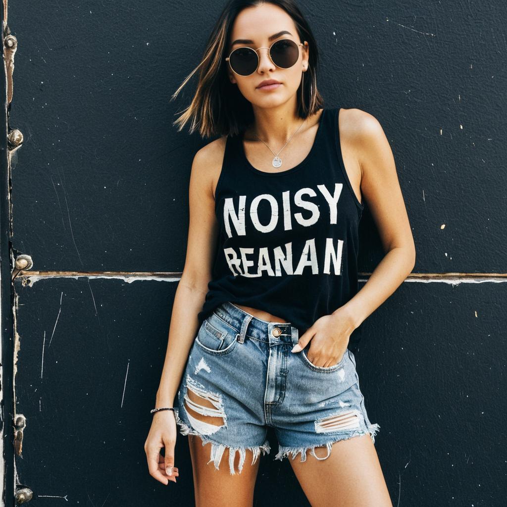 Woman, casual, black graphic tank top with white lettering and imagery, distressed denim shorts, frayed hem, oversized round sunglasses.
