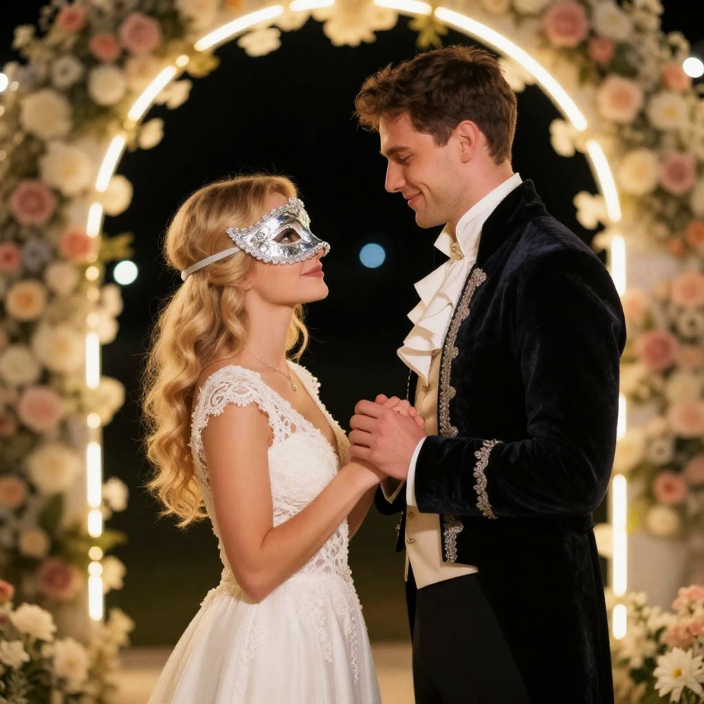 Photograph of a couple in formal attire. Blonde woman in front wears a silver mask, light blue, sparkling gown with sheer sleeves, and a blue ribbon. Man behind in gray suit with white shirt and blue tie, also wearing a silver mask. Background has string lights and foliage. Woman holds a small, ured clutch. Both have intense, focused facial expressions.