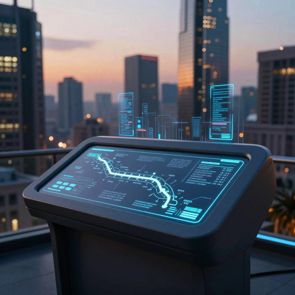 Photograph of a futuristic, illuminated touchscreen map in a high-rise cityscape at sunset, displaying glowing blue lines and data charts.