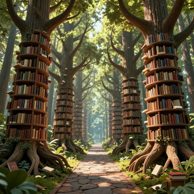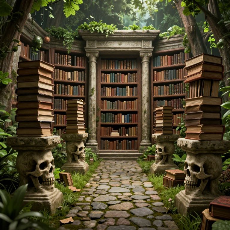 A hauntingly surreal 3D-rendered scene depicts an ancient library where books sprout from skull-shaped pedestals, surrounded by lush greenery and cobblestone pathways, evoking a mysterious atmosphere of forgotten knowledge and whispered secrets.