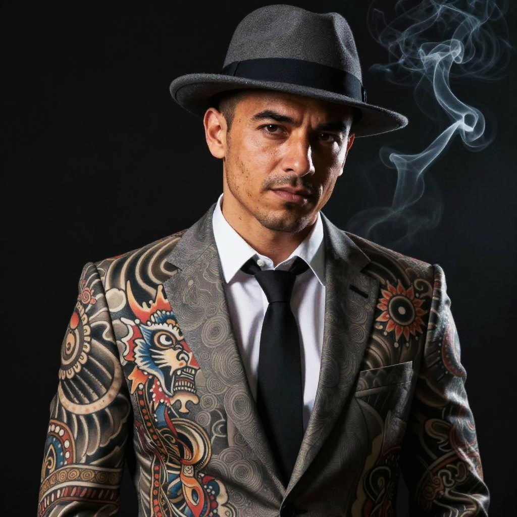 Realistic photo.Harem a neo-traditional tattoo design of a man of Italian descent, wearing a stylish suit with a fedora, dark background, smoke floating around, charismatic expression realistic photo