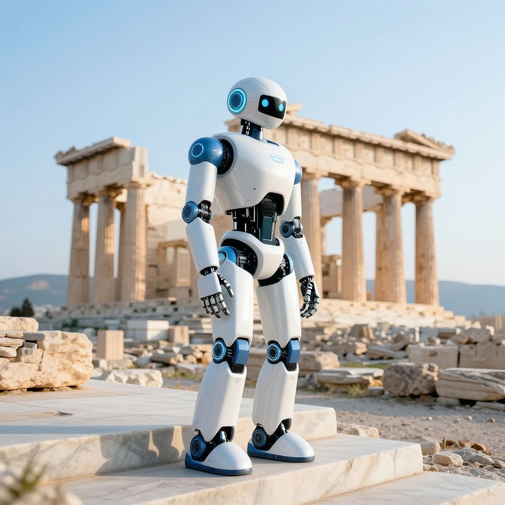 A futuristic white and blue robot with illuminated accents stands on the marble steps of the ancient Parthenon temple in Athens, Greece. The robot appears contemplative amidst the classical Greek ruins, with rolling hills and a clear sky in the background, illuminated by soft morning sunlight.