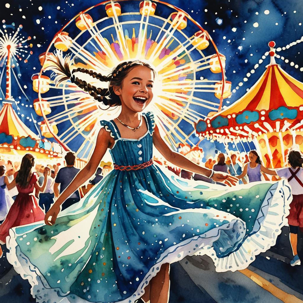 Watercolor style artwork of a joyful young girl with braided hair and a flowing blue dress dancing at a lively carnival. Brightly lit carnival rides and colorful tents fill the background, with people enjoying the festive atmosphere under a starry night sky. The scene captures energetic movement and exuberant expressions in a highly dramatic composition.