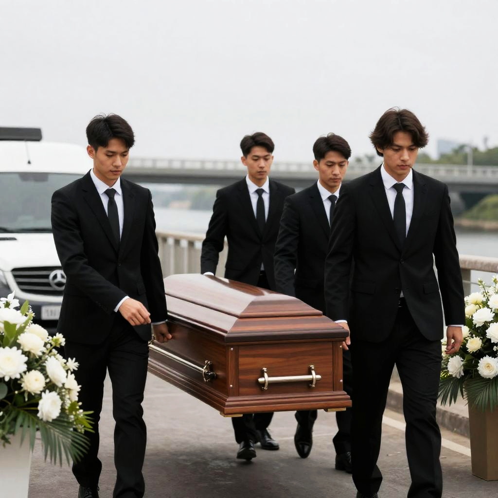Three men in black suits carry a wooden coffin from a van, bridge in the background, overcast sky. Foreground has floral arrangements. Man on left has short dark hair, middle man with hands in pockets, right man with medium-length dark hair. Coffin centered, flowers on left and right.