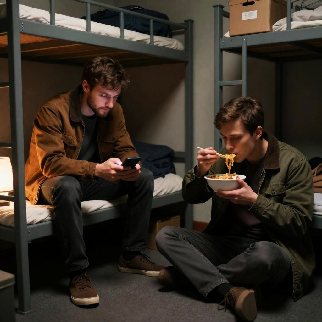 Photograph of two men in a dimly lit, cramped bunkroom. The man on the left, with short brown hair and a beard, sits on a bottom bunk, reading a smartphone. He wears a brown jacket and dark pants. The man on the right, with short brown hair, sits on the floor, eating from a bowl. He wears a green jacket and gray pants. A lamp on the left casts a soft glow. Bunks and stacked boxes fill the background. Both men have focused expressions.