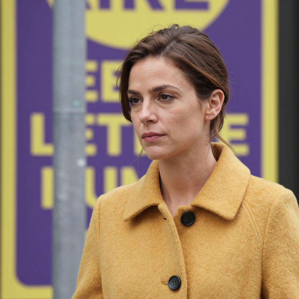 Two people standing outdoors. Man on left with gray hair, brown jacket, and maroon shirt, looks down. Woman on right with brown hair in bun, navy blue cardigan, and white top, smiles. Background includes house with gray roof and brick wall. Both stand with arms at sides.