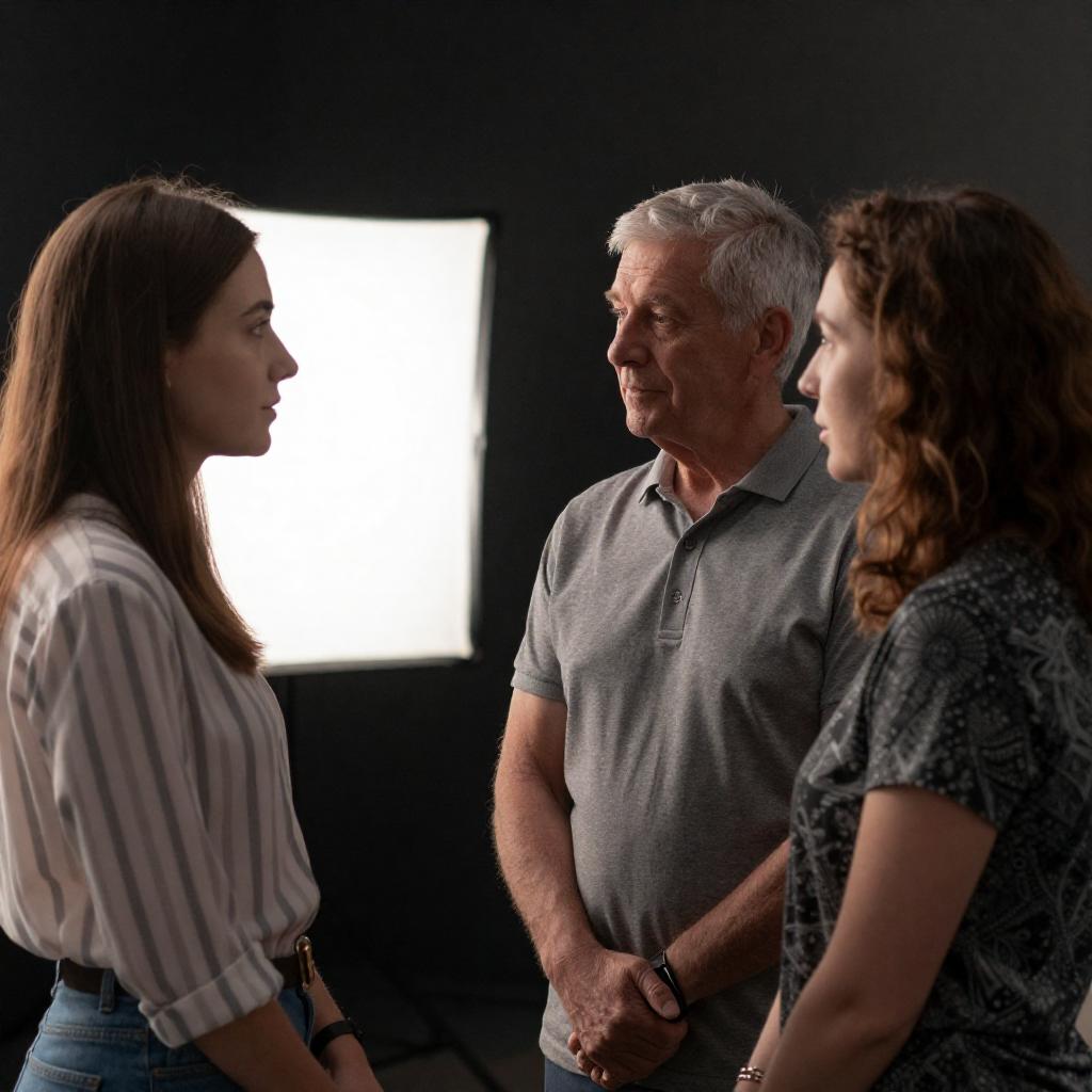 Photograph of a tense scene: a middle-aged man with short gray hair, wearing a dark blue jacket, forcefully grabs the chin of a blonde woman with a ponytail, dressed in a pink cardigan and gray tank top. A blonde woman with short hair, wearing a black top, looks on in concern. They are seated on a beige couch in a dimly lit room with wooden blinds in the background.
