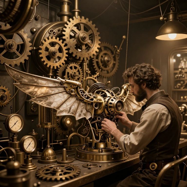 A steampunk inventor in Victorian-era inspired clothing working meticulously on intricately detailed mechanical wings. The workshop is filled with brass gears, glowing gauges, and complex machinery, all bathed in warm sepia tones, reflecting a vintage and imaginative atmosphere.