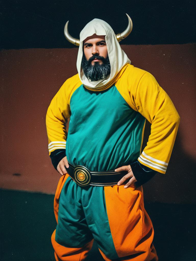 Man cosplay. Wearing Mogo costume. Realistic photo. Dressed as Mogo --sref 1392