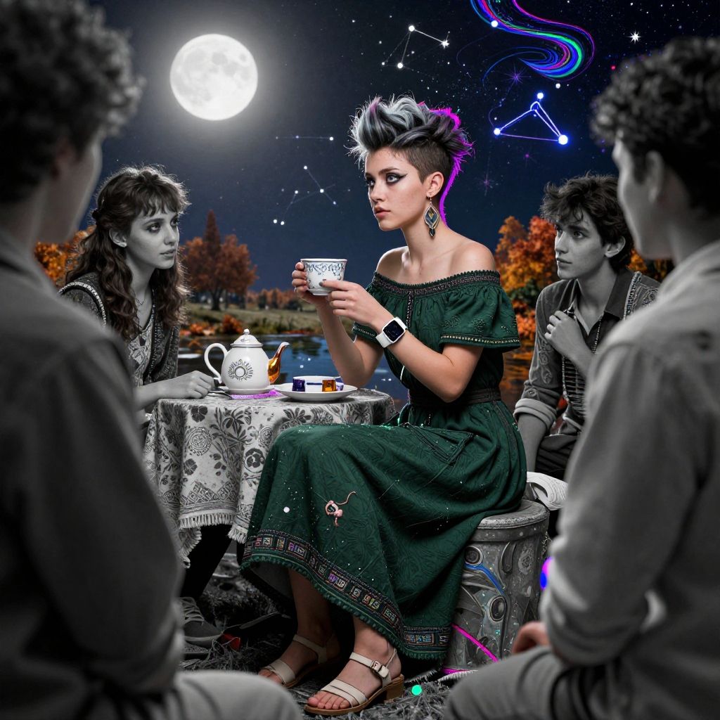 This digital illustration depicts a nighttime scene with a full moon in the starry sky. A striking woman with a mohawk styled with purple and black hair sits at a table, wearing an off-shoulder green dress with intricate patterns and holding a delicate teacup. She has purple earrings and a watch on her left wrist. Surrounding her are three grayscale figures, two women and one man, seated on chairs and a stool, observing her. The table is adorned with a patterned tablecloth, a teapot, and a sugar bowl. Autumn trees are visible in the background, and constellations with colorful lines illuminate the sky. The overall style combines realism with a surreal, mystical touch.