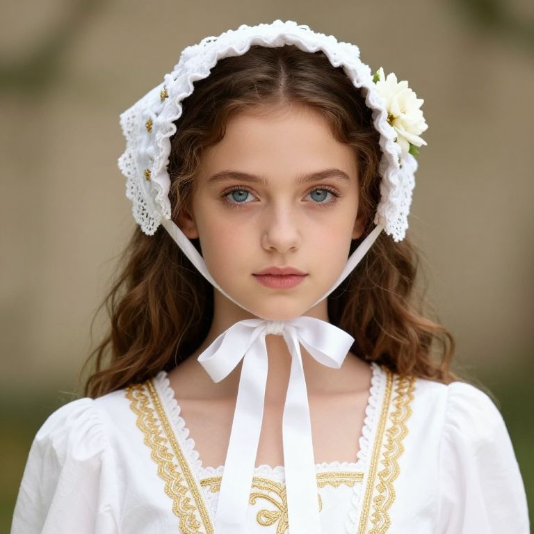 Girl with brown hair and blue eyes wearing a white dress with gold embroidery and a white bonnet with a flower on top.
