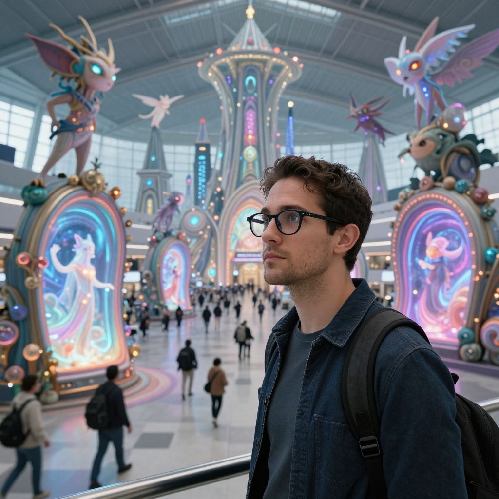 Photograph of a man with short brown hair, black-framed glasses, and a black denim shirt standing in a brightly lit, futuristic airport terminal. He has a slight beard and carries a black backpack. Behind him, the terminal features large, illuminated, fantasy-themed sculptures of winged creatures with glowing blue and pink lights, surrounded by people walking. The terminal ceiling is high with large windows, and the floor is polished white. The man stands in the foreground, slightly to the right, gazing off to the left. The scene is vibrant with a mix of modern and whimsical elements.