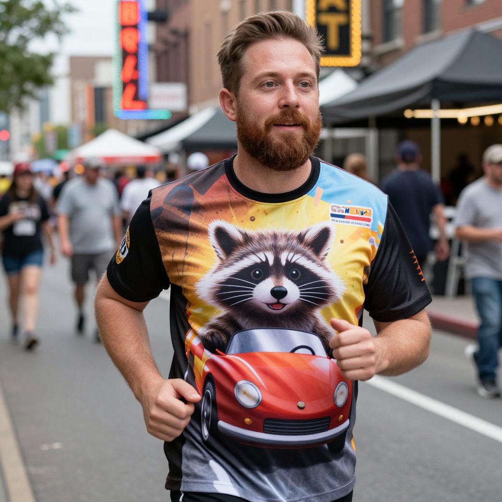 A vibrant, natural-light photo of a man in his 30s with a warm brown beard and kind eyes, dressed in a custom wacky races shirt featuring a wild, animated raccoon in a race car, jogging through a bustling downtown street with neon signs and a lively festival atmosphere.