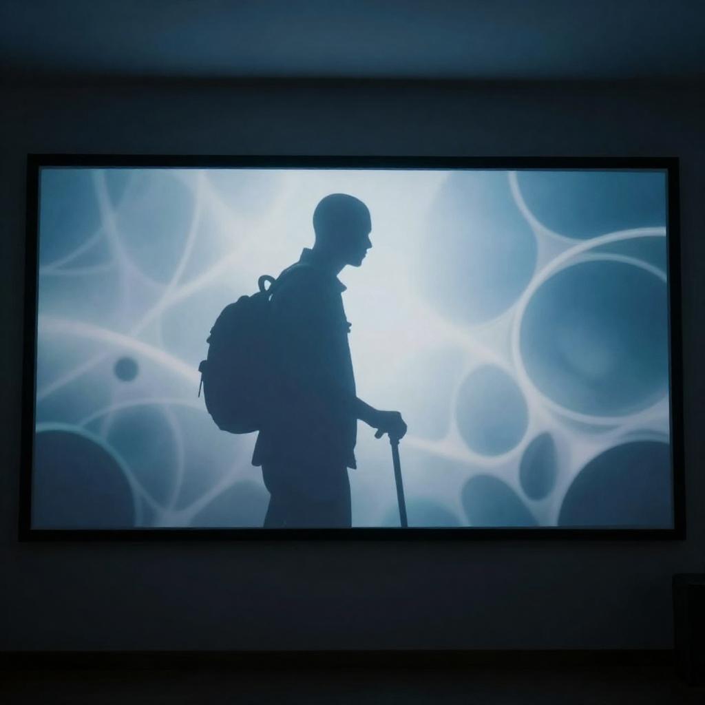 Large screen displaying blue-lit, silhouetted figure with bald head, wearing backpack and holding cane, standing left of image. Background features abstract, ethereal, glowing blue and white pattern. Darkened room, minimal lighting, screen centered.