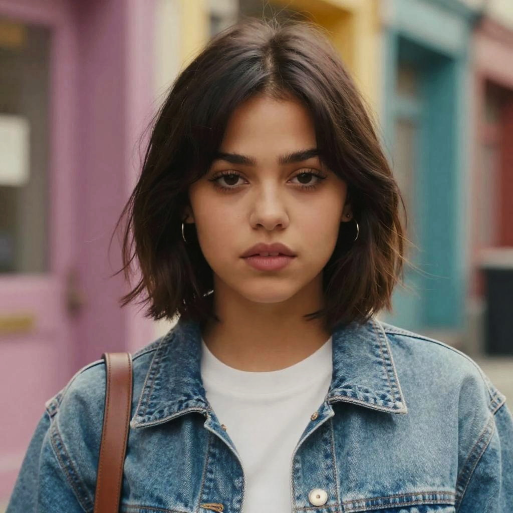 Jenna Ortega hair short trendy haircut, colorful graffiti wall, summer vibe, playful smile, high resolution, sharp focus, contemporary street style portrait