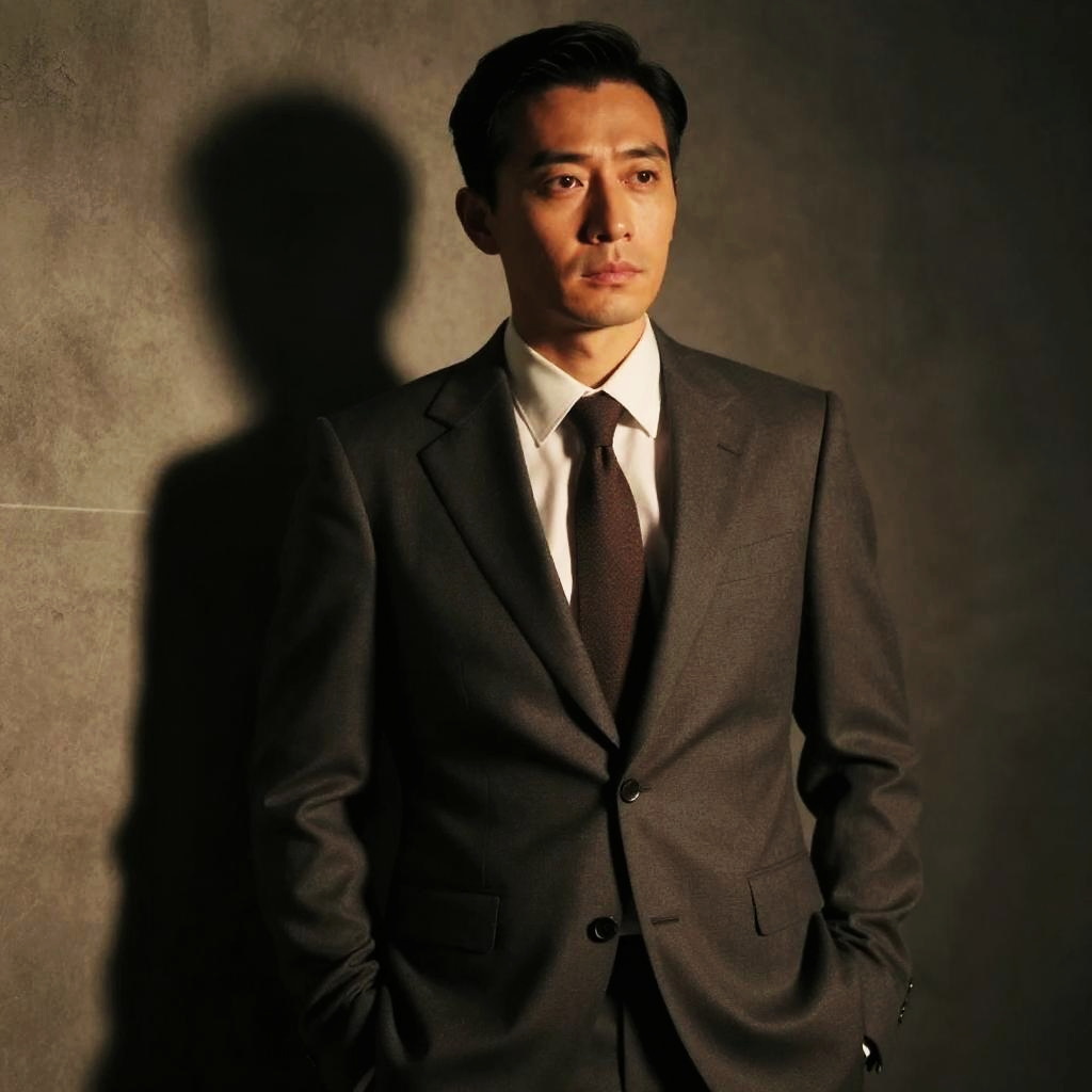 A photograph of a young Asian man with short, black hair, standing against a dark, textured wall. He is wearing a dark gray, well-fitted suit with a white dress shirt and a black tie. The lighting casts a sharp, elongated shadow of his head and upper body to the left of him, creating a dramatic effect. His expression is neutral, and he stands with his hands in his pockets. The overall tone of the image is dark and moody, with a focus on the contrast between his lit face and shadowed background.
