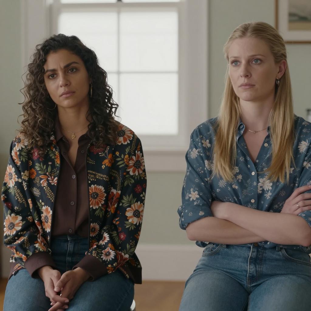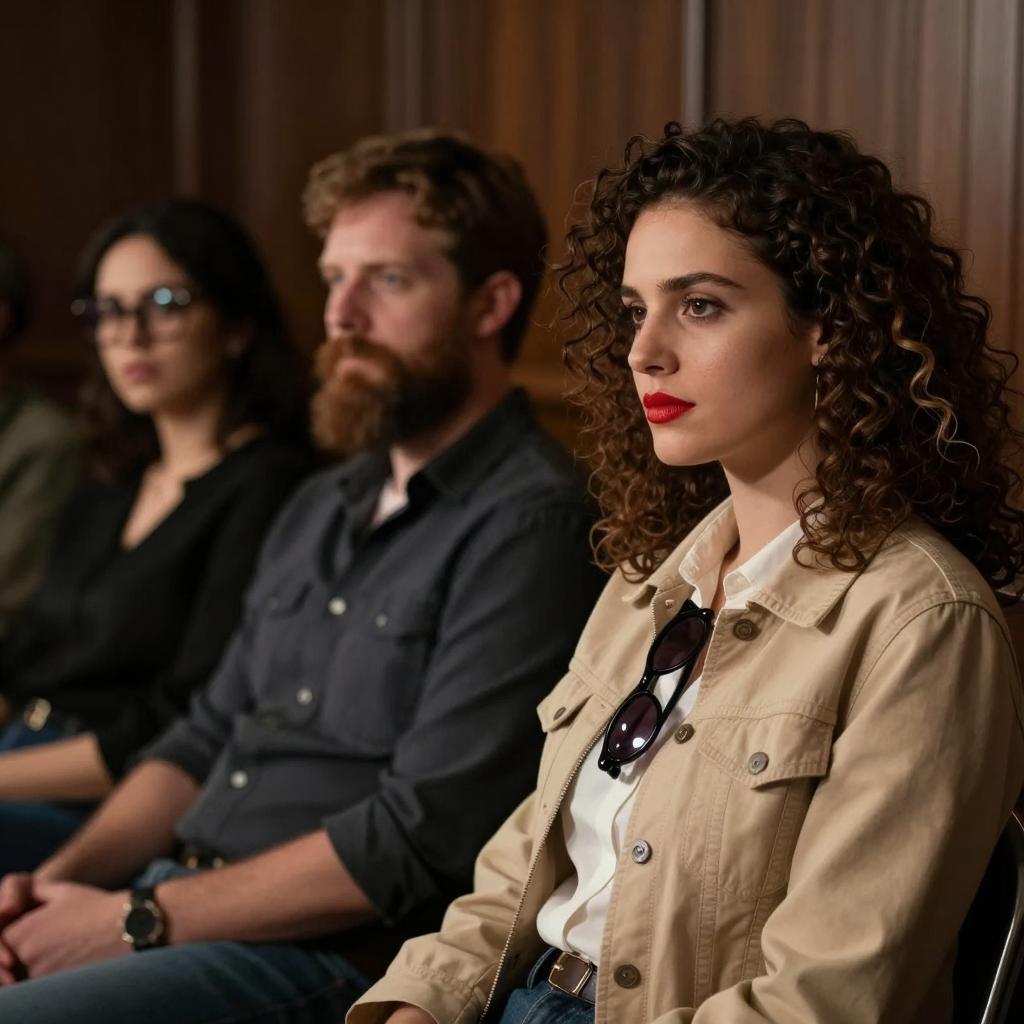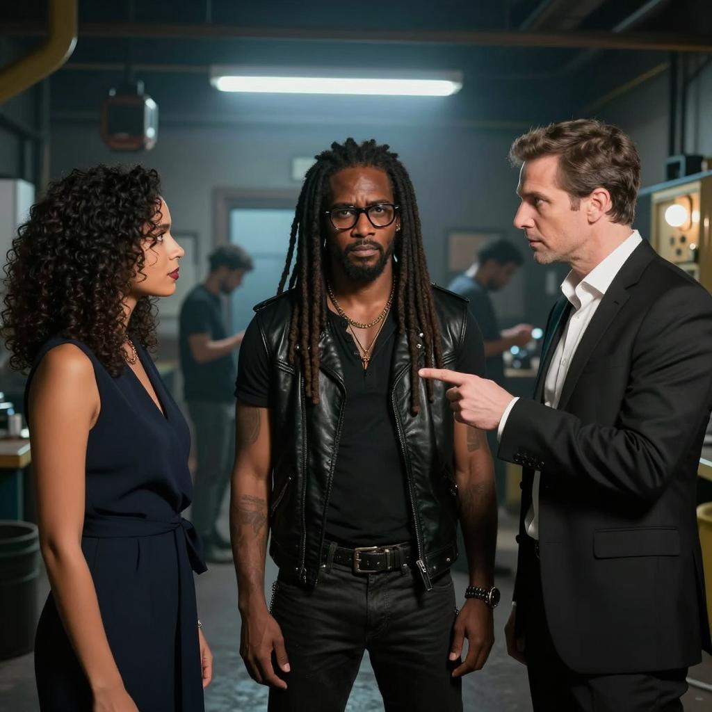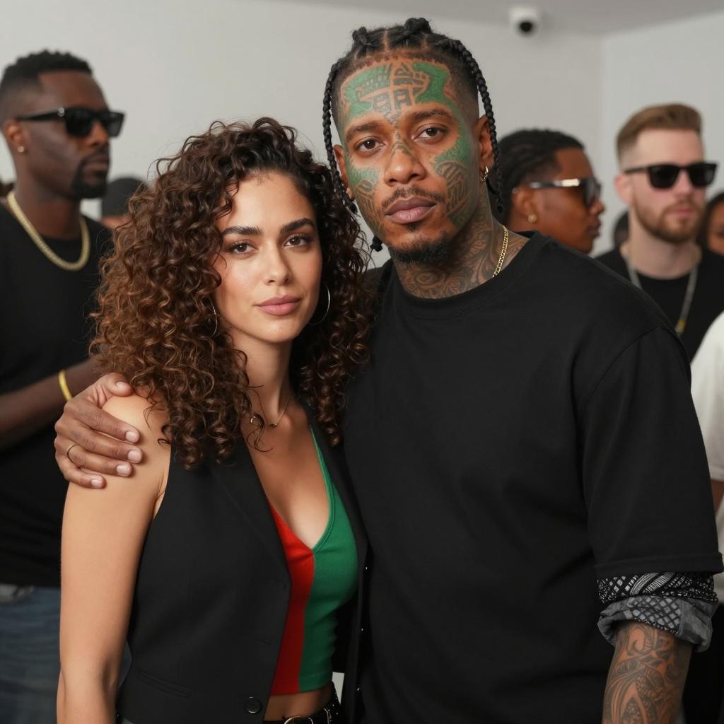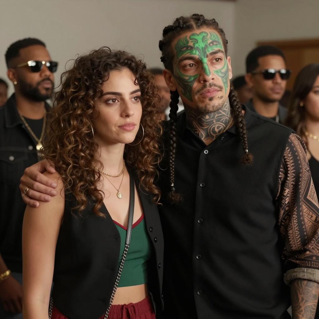 A woman and a man standing close together in a crowded room. The woman has curly brown hair, wearing a black vest over a green and red top, looking to the side. The man has braided hair, large green and black facial tattoos, and wears a black shirt with a patterned sleeve, looking at the camera. Several other people with dark clothing and sunglasses are in the blurred background. The man's arm is around the woman's shoulder.