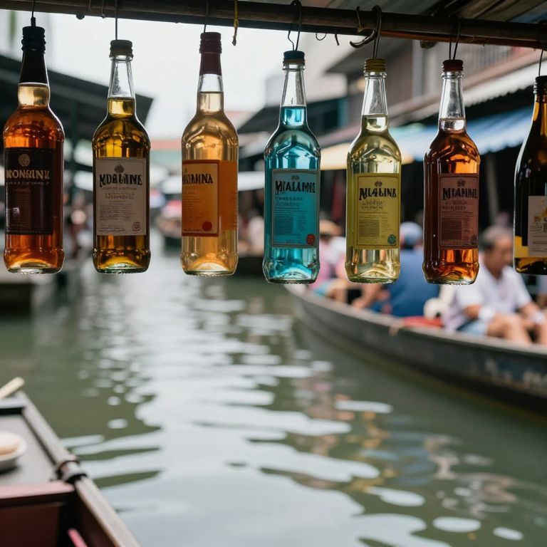 Suspended between past and present, the floating market whispers tales of forgotten moments, each bottle a vessel of memory whose liquid hues shift like emotions, mirroring the buyer's soul in a dance of reflection and introspection.
