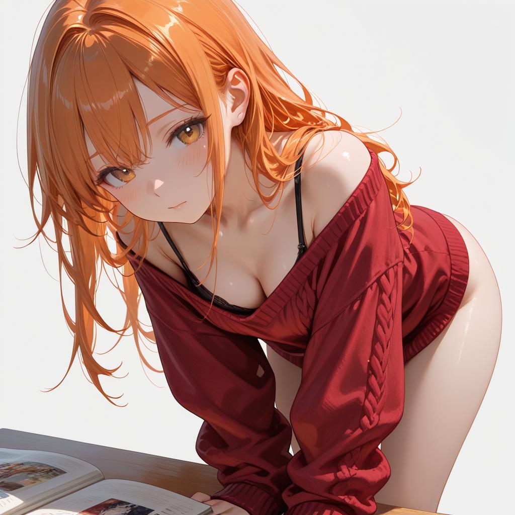 (1girl, solo, masterpiece, 8k, HDR), ginger girl, character concept art of a beautiful woman leaning over, red sweater falling off her shoulder, cleavage, extremely sexy, seductive, long hair, luscious lips, comic book art, rough colored sketch, (small breasts, big hips, looking at the viewer), (simple background, white background)