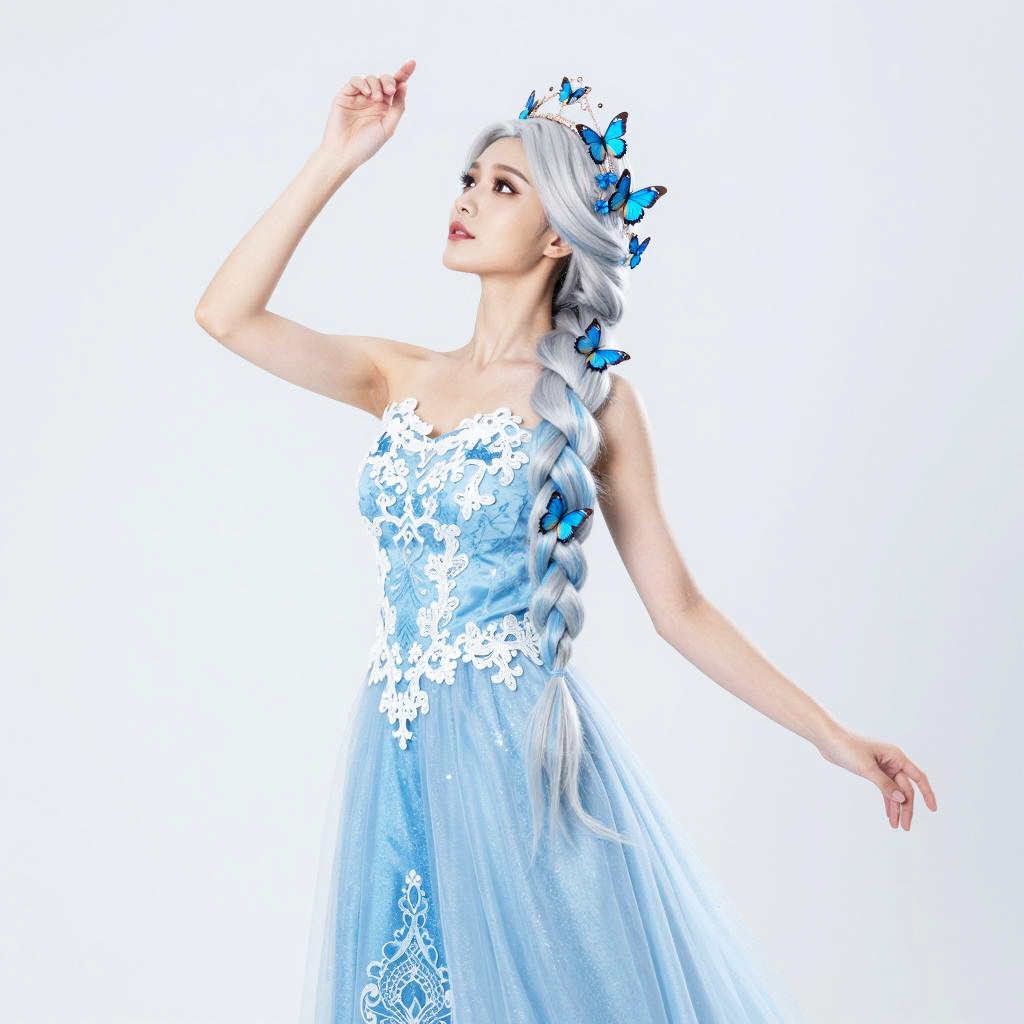 A woman dressed in an elegant icy blue gown with intricate lace detailing poses gracefully against a soft white background. Her long, braided silver-blue hair flows dynamically, complemented by a delicate crown adorned with blue butterflies, creating a fantasy-inspired, ethereal look.