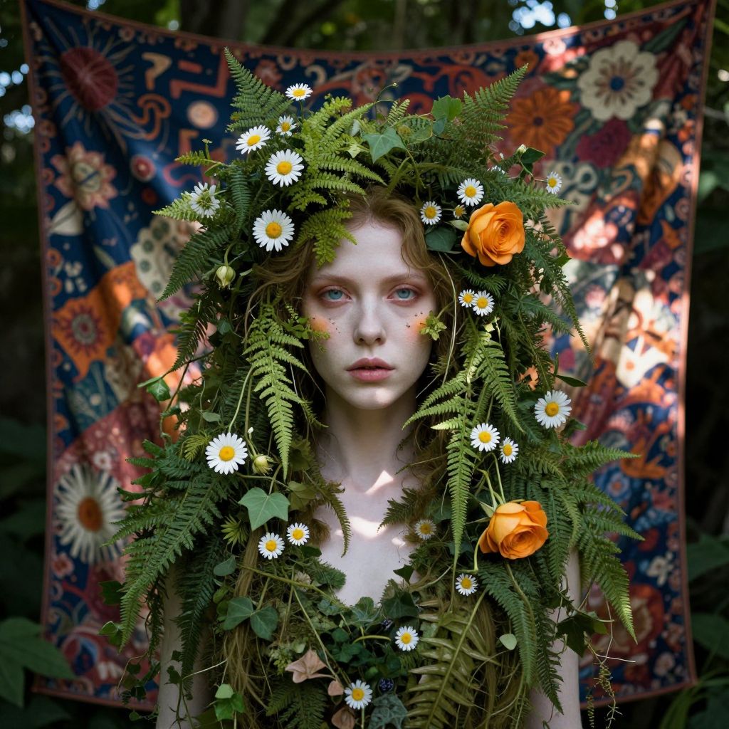 A photorealistic digital portrait showcases an enigmatic figure with pale skin and piercing blue eyes, their features partially veiled by a vibrant tapestry of floral patterns and abstract shapes. The subject's hair, akin to cascading ivy tendrils intertwined with daisies, roses, and ferns, creates a mesmerizing blend of human and botanical elements. As sunlight filters through the foliage, casting dappled shadows across this verdant dreamscape, the figure seems to emerge from a realm where reality and fantasy intertwine seamlessly, inviting viewers on an exploration of their subconscious desires and fears.