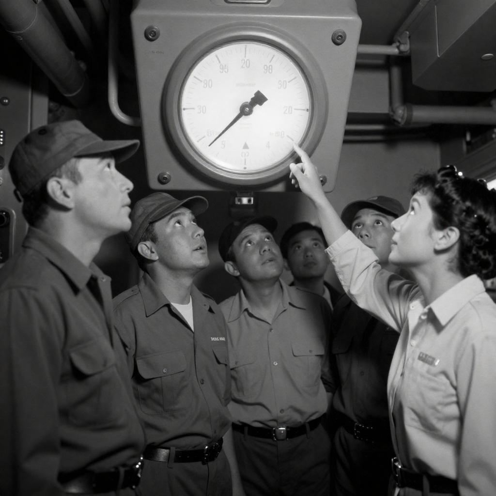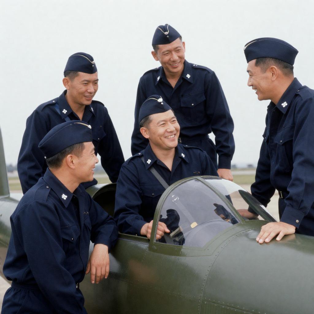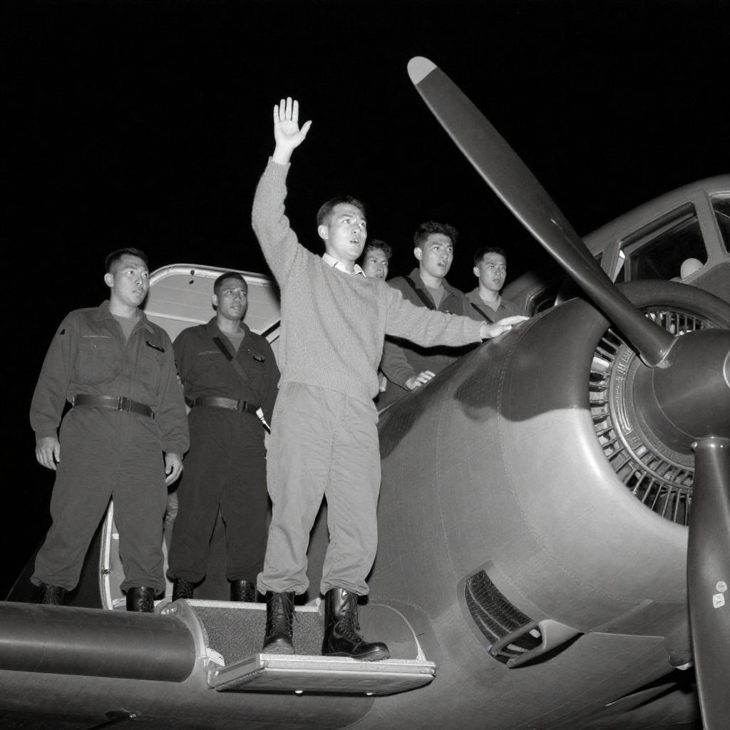 Black-and-white photograph of a group of men boarding a military aircraft at night. Central figure, wearing a sweater, raises his arm while standing on the aircraft's wing. Other men, in various uniforms, climb the aircraft. Large propeller in front, aircraft nose on the right. Intense expressions visible on some faces. 6-8 people total. Dark background.
